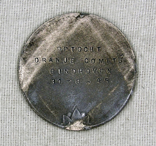 vz.: twee leeuwen houdende wapenschild waaronder: JE MAINTIENDRAI az.: Optocht Oranje Comite Eindhoven 31-8-45