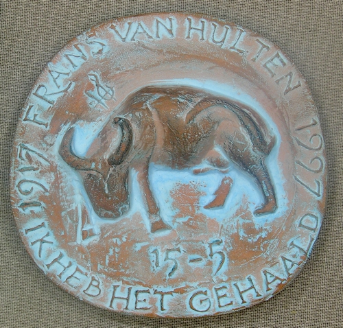Penning Frans van Hulten 80 jaar - 1997, keramiek, 74 x 77 x 17 mm, opschrift: 'FRANS VAN HULTEN 1917 1997 15-5 IK HEB HET GEHAALD', gemonogrammeerd: 'H + f-sleutel'