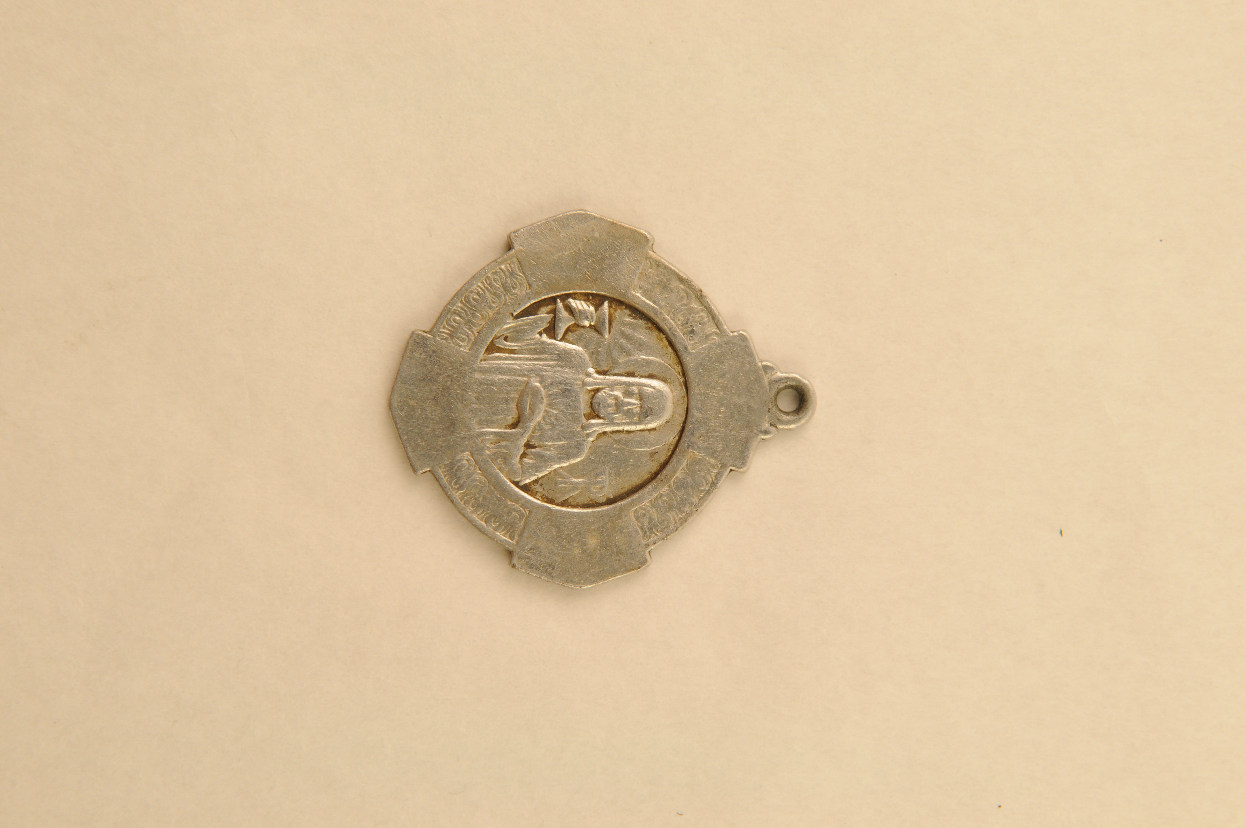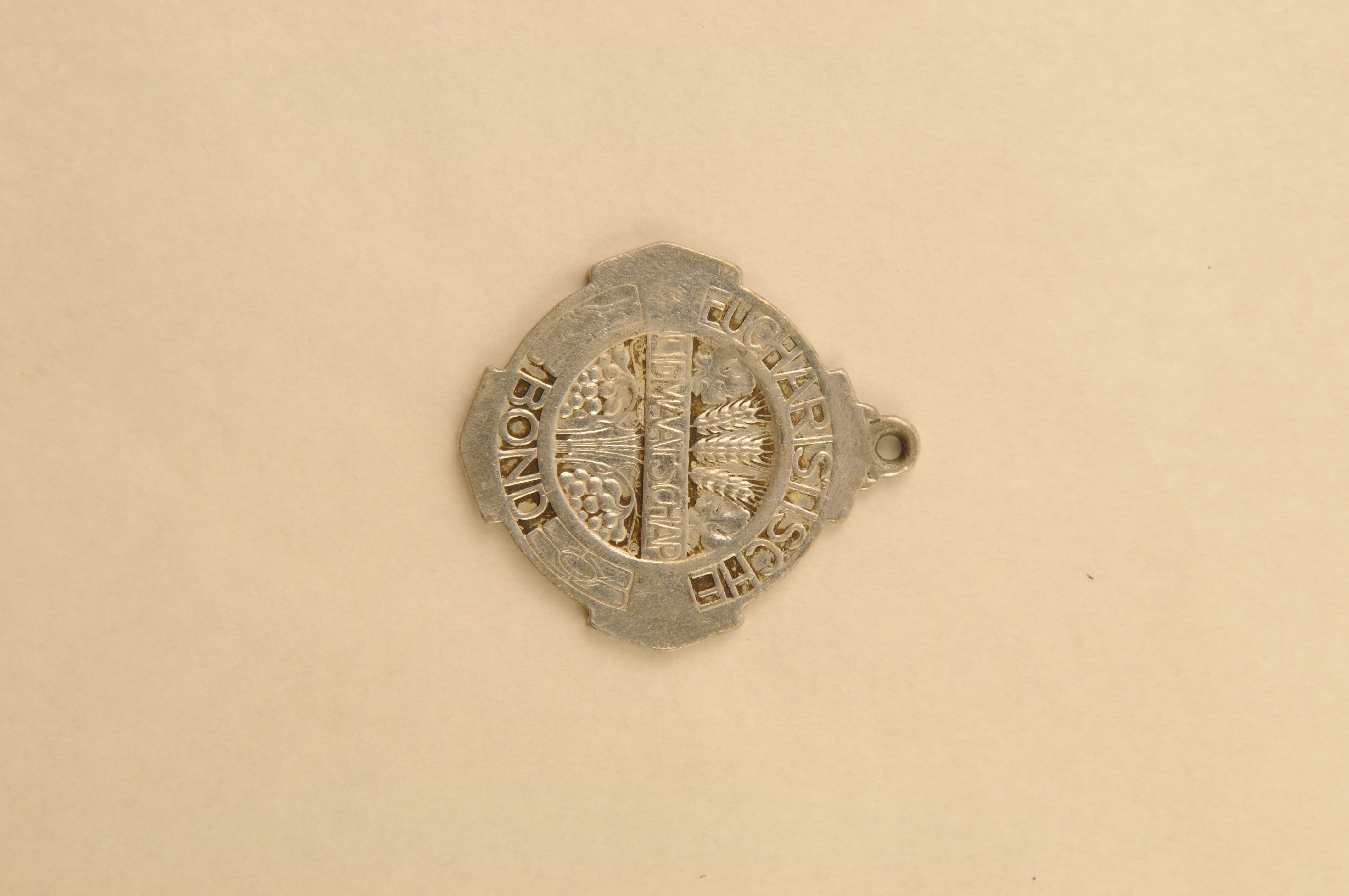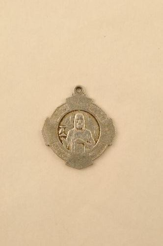 Religieuze medaille/draagpenning, amandelvormig, materiaal: metaal, verzilverd, vz. het Heilig Hart van Christus met randschrift ‘+AMATUM SIT UBIQUE SANCTISSIMUM COR JESU !’, kz. het Heilig Hart van Maria met randschrift ‘DULCE COR MARIAE, SIS, QUAESO SALUS MEA’, 5,3 x 2,8 cm