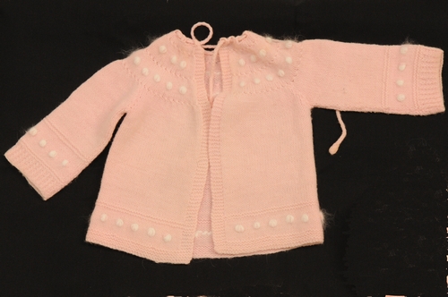 Babymuts, materiaal: wol, kleur: rose, lengte 17 cm, breedte 13 cm, boordrand van mutsje versierd met witte bolletjes, in kruin ster gebreid, in de hals randje aangehaakt om koordje door te rijgen, huisvlijt