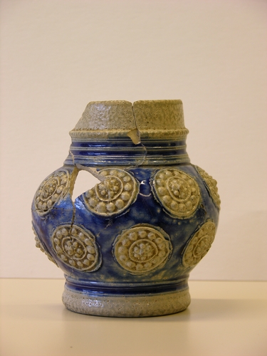 Fragment van een steengoed kannetje met reliëfversiering op wand en hals, grijs steengoed met kobalt en zoutglazuur, herkomst Westerwald, einde 17e eeuw De kastelen Blaarthem en Gagelbosch bij Eindhoven: archeologisch onderzoek in Eindhoven deel 1, 1996, p. 76 nr 2 (sic), Opm. G.S.: dit is een andere kan !! inv.nr archeologisch depot gemeente: EHV - GB ...