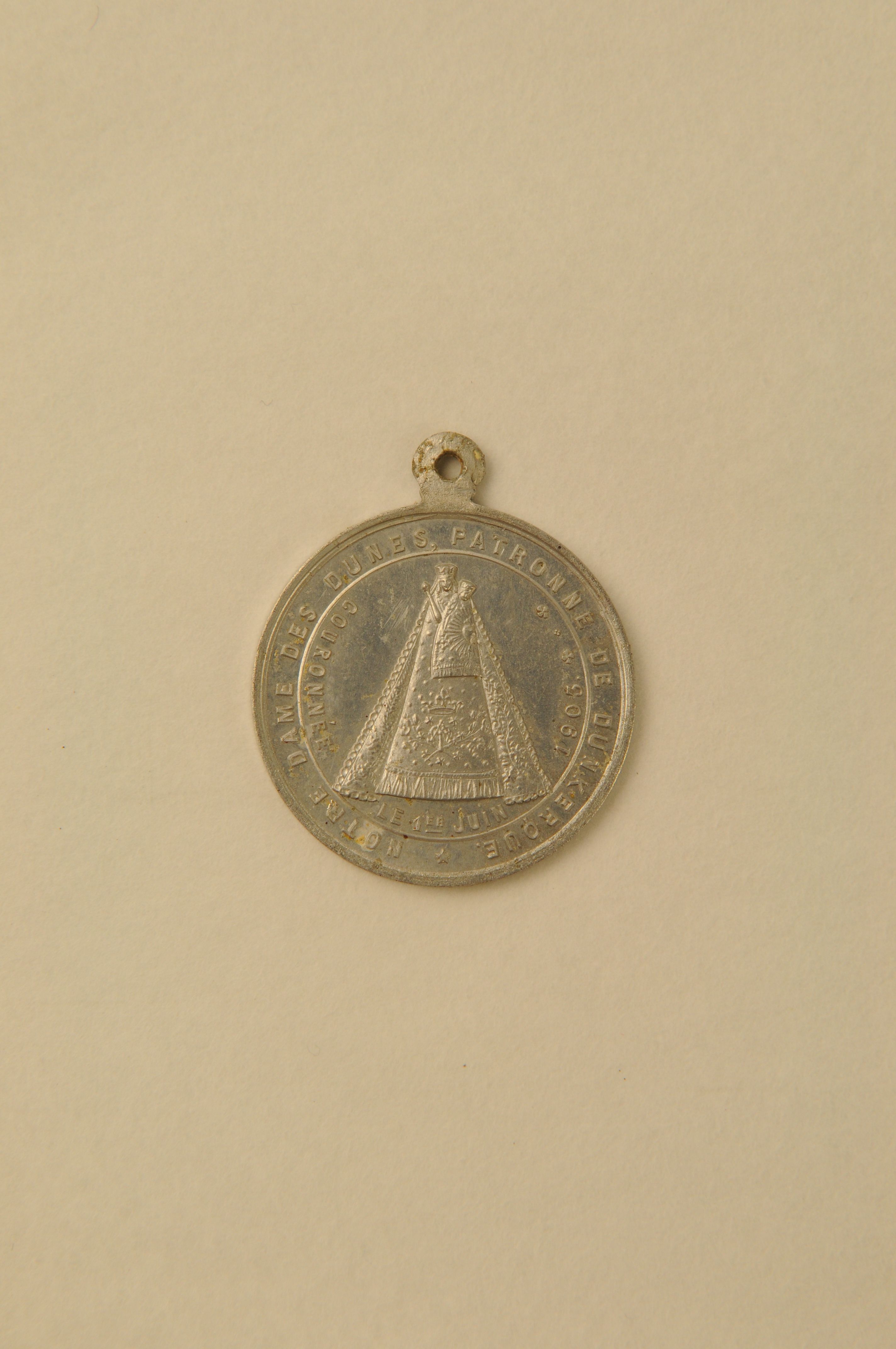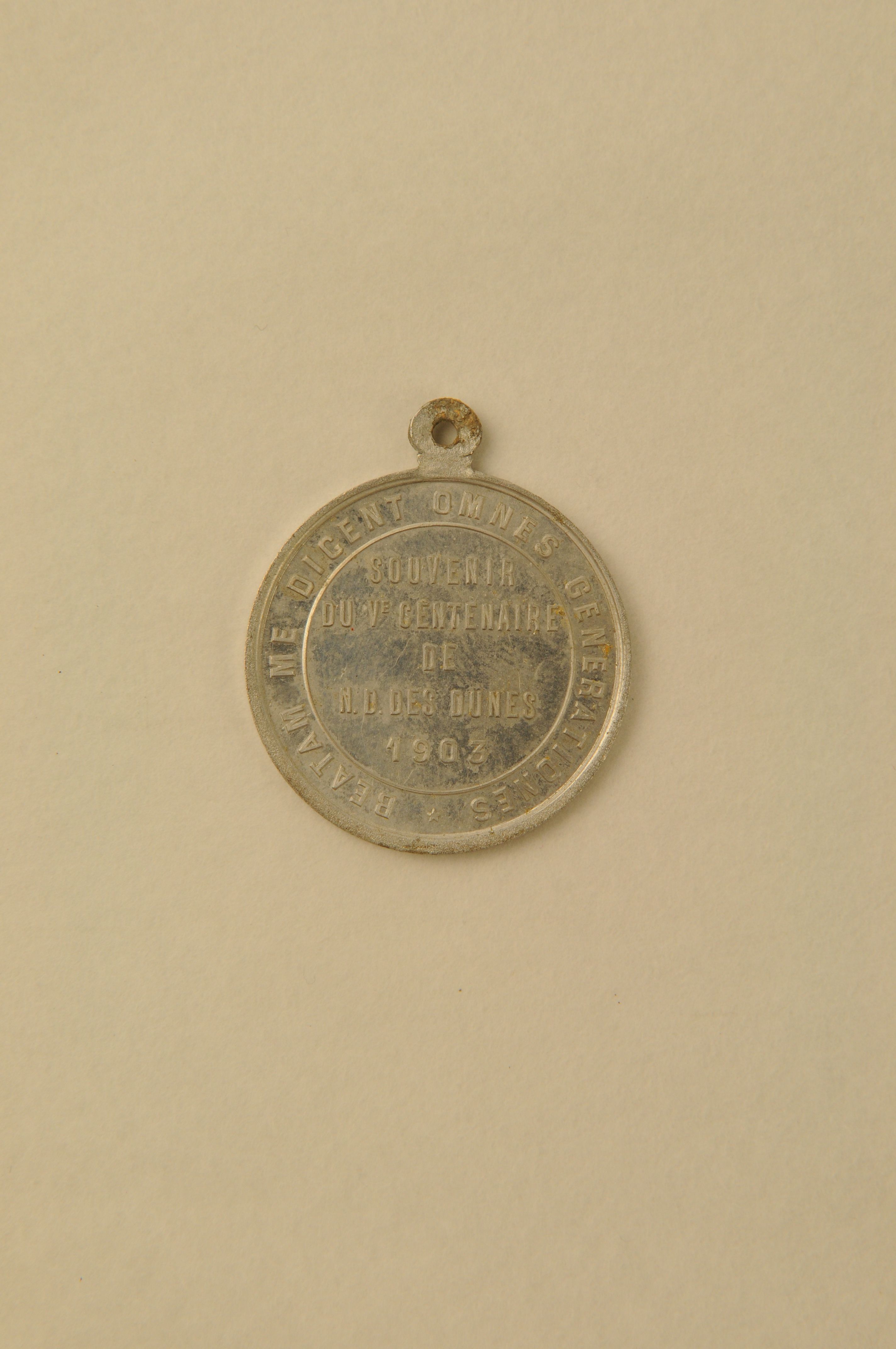 Religieuze medaille/draagpenning O.L.V. van de Duinen te Duinkerke - 1903, aluminium, ronde draagmedaille met op de vz. een reliëfafbeelding van O.LV. van de Duinen, daaronder het opschrift ‘LE 1er JUIN’, en het randschrift ‘NOTRE DAME DES DUNES, PATRONNE DE DUNKERQUE’, kz. op centraal rond veld het opschrift ‘SOUVENIR DU Ve CENTENAIRE DE N.D. DES DUNES ...