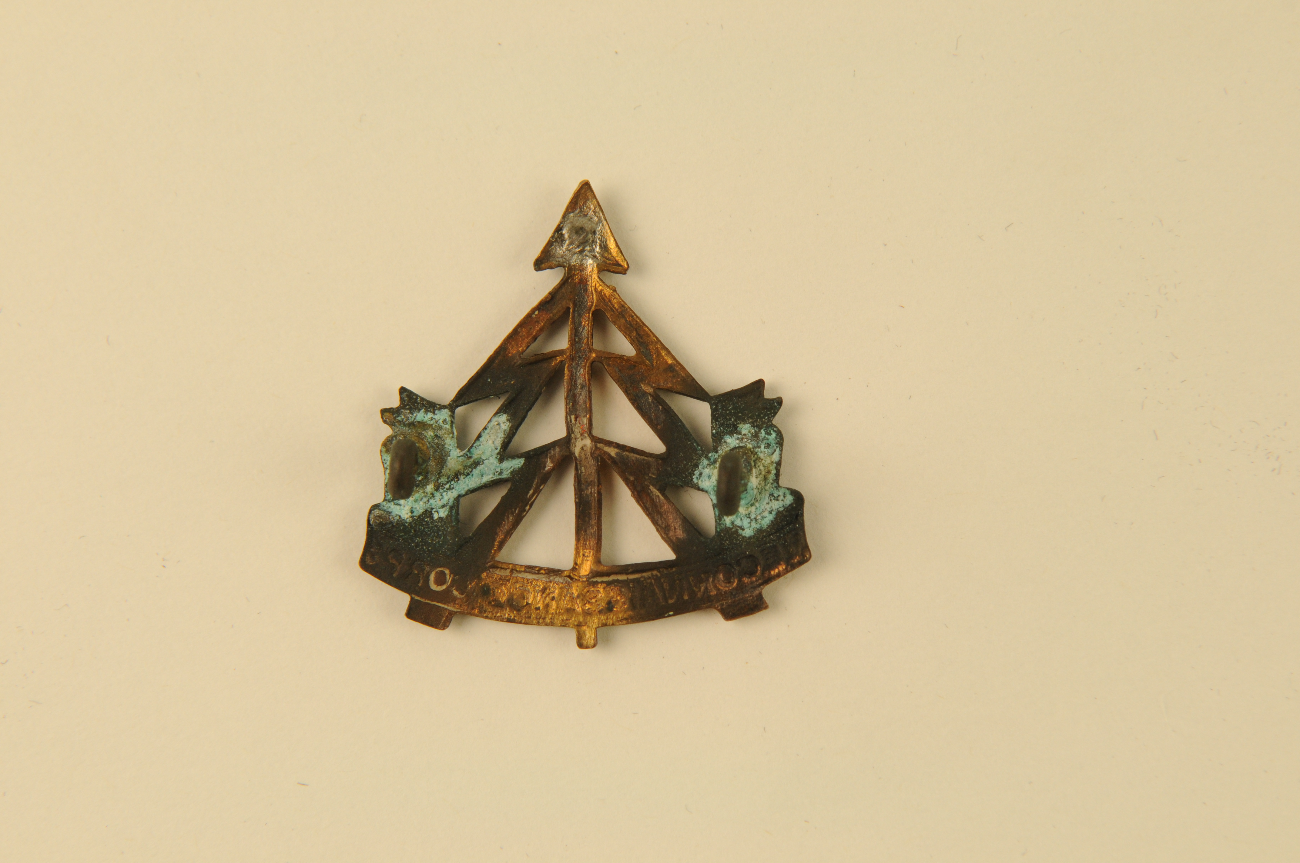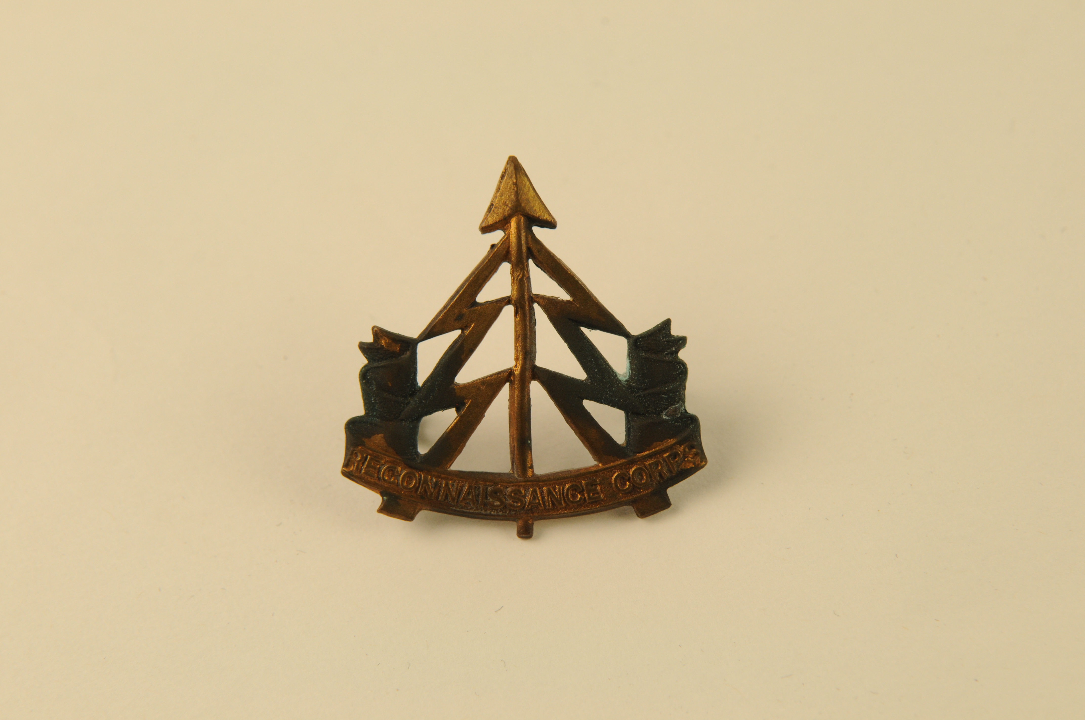 Baret-embleem van het Reconnaissance Corps - 1944-1945, materiaal: messing, afmetingen: 4 x 3,8 x 0,6 cm, brits baret-embleem, met pijl en twee bliksemschichten en op een banderol het opschrift “RECONNAISSANCE CORPS”