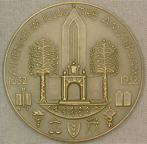 Penning “Derde Eeuwfeest Athenaeum Illustre Amsterdam” (eerste penning van de Vereniging voor Penningkunst 1932) – L.H. Sondaar 1932, uitgevoerd door Koninklijke Begeer Voorschoten. Slagpenning, brons, diameter 60 mm, randdikte 3,5 mm. Voorzijde: gevel van de Agnietenkapel, door twee boompjes omgeven, daaronder de symbolen van de zes faculteiten van deze voorloper van de Universiteit van Amsterdam. ...