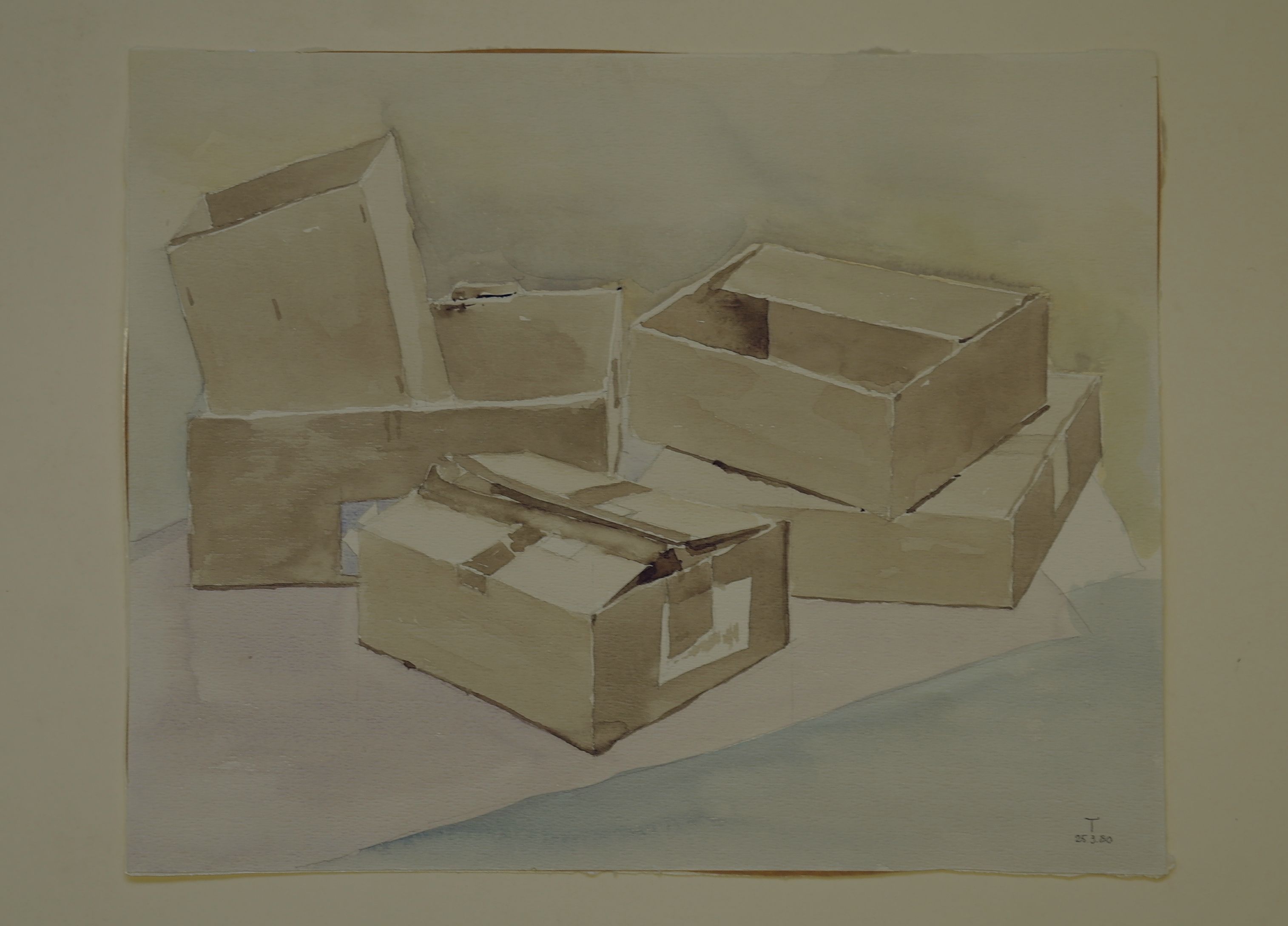 Zonder titel (stilleven met lege kartonnen dozen) – 1980, potlood en aquarel/papier, gemonogrammeerd en gedateerd r.o.: T 25.3.80, 350 x 440 mm Zonder titel (stilleven met lege kartonnen dozen) – 1980, potlood en aquarel/papier, gemonogrammeerd en gedateerd r.o.: T 25.3.80, 35 x 44 cm