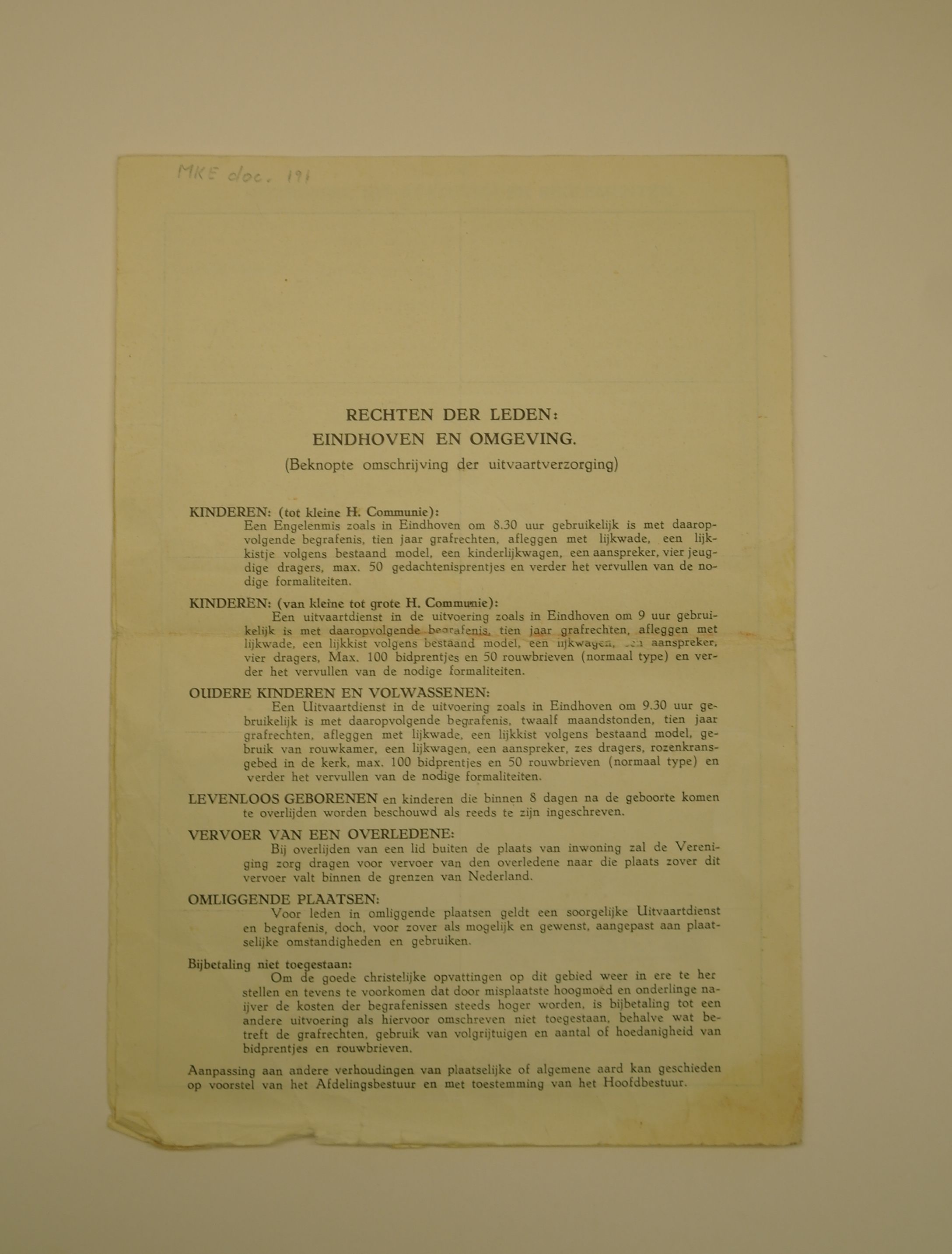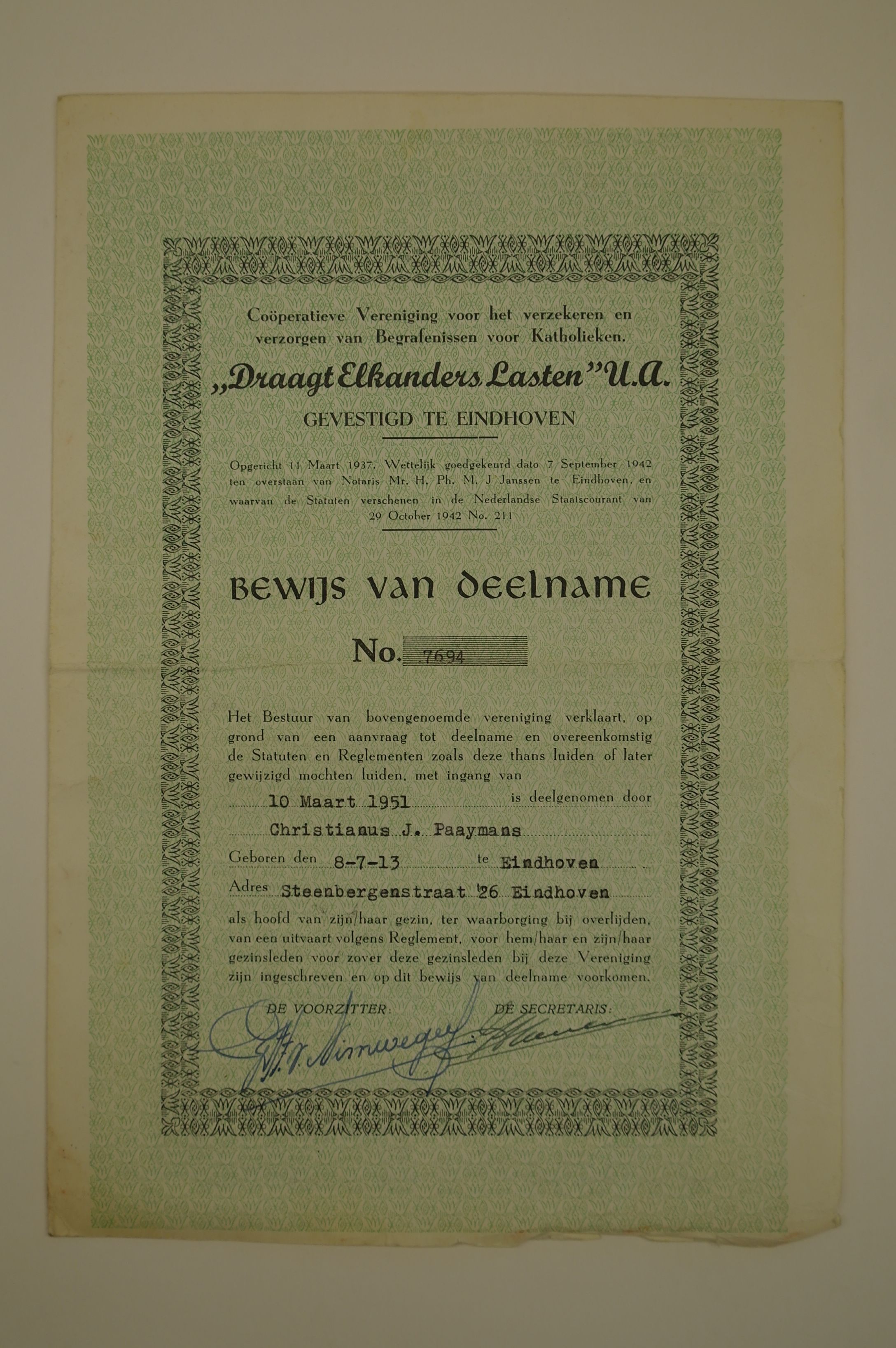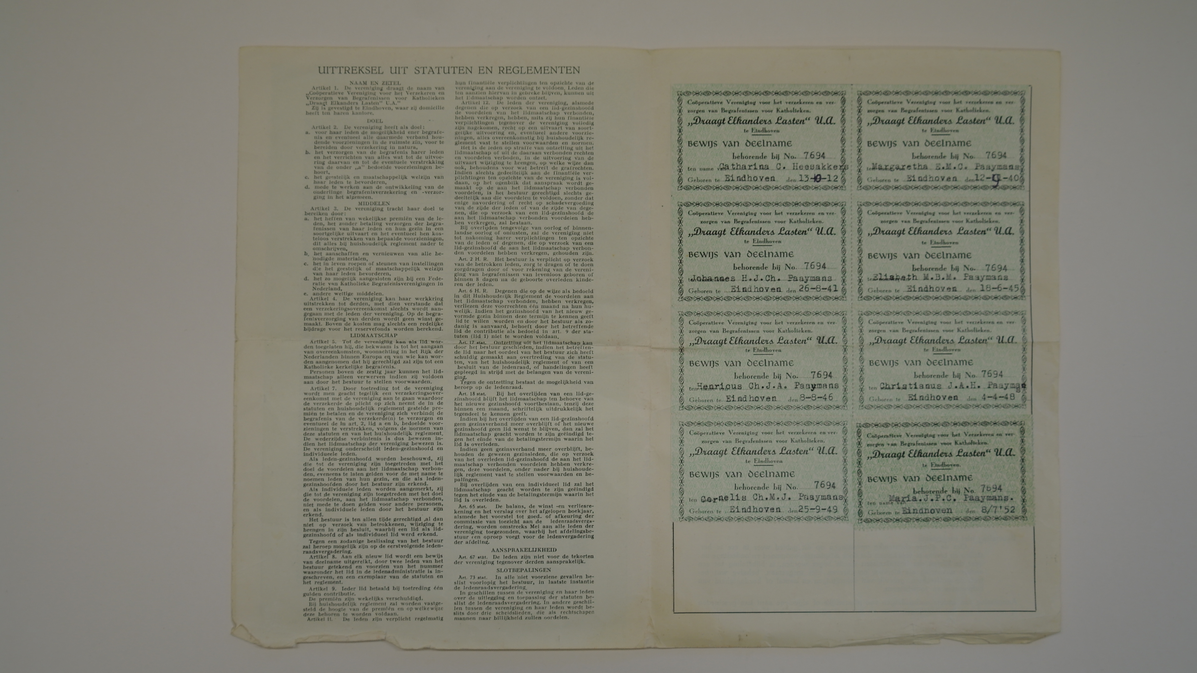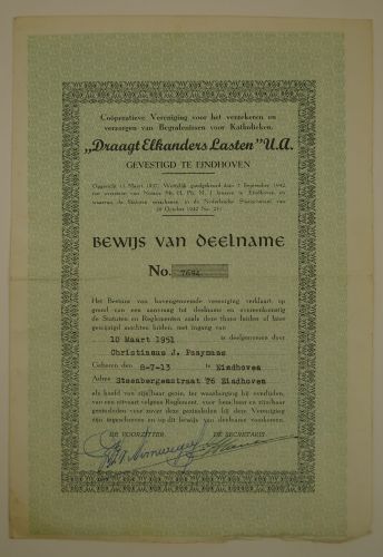 Bewijs van deelname aan de Cooperatieve Vereniging voor het verzekeren en verzorgen van Begrafenissen voor Katholieken ‘Draagt Elkanders Lasten’ U.A. gevestigd te Eindhoven, ten name van Christianus J. Paaymans, Steenbergenstraat 26 Eindhoven, met op tweede blad acht geplakte deelname-bewijzen, (voor elk gezinslid een), materiaal: drukwerk/papier, 27 x 18,6 cm