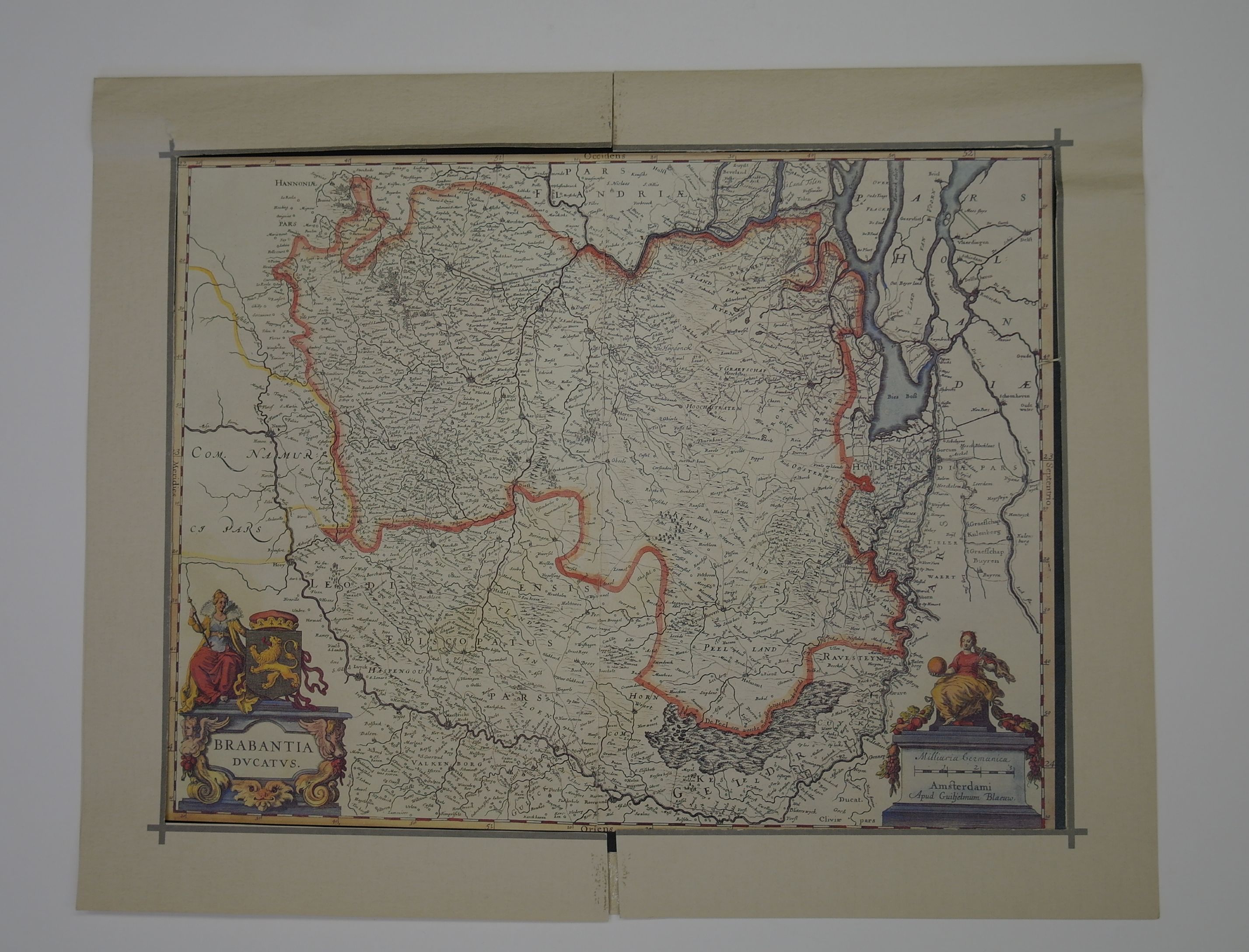 l.o. geannoteerd in cartouche: BRABANTIA DVCATVS r.o. geannoteerd in cartouche: Milliaria Germanica Amsterdami Apud Guiljelmum Blaeuw.