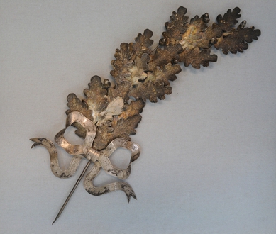 Lauwertak Burgerwacht Oirschot - 1925, materiaal: zilver of verzilverd metaal, afmetingen: 29 x 13 x 3,5 cm, lauwertak van 19 eikenbladeren waartussen 7 eikels, onderaan een symmetrisch gevormd banderole-lint met het inschrift: 'NAT. SCHIETW. B.W. OIRSCHOT 2E KORPS PRIJS 26-7-25' opschrift: NAT. SCHIETW. B.W. OIRSCHOT 2E KORPS PRIJS 26-7-25