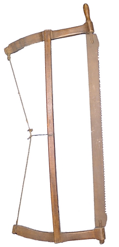 IJzeren zaag in een houten frame met een gespannen koord van ijzertouw. Met houten handgreep