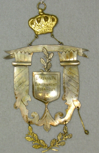 opschrift: 6E KORPS PR. BURGERWACHT UDENHOUT '28 meesterteken: JvH 2 (= Fa. J. van Hout Ververgaard, Eindhoven)