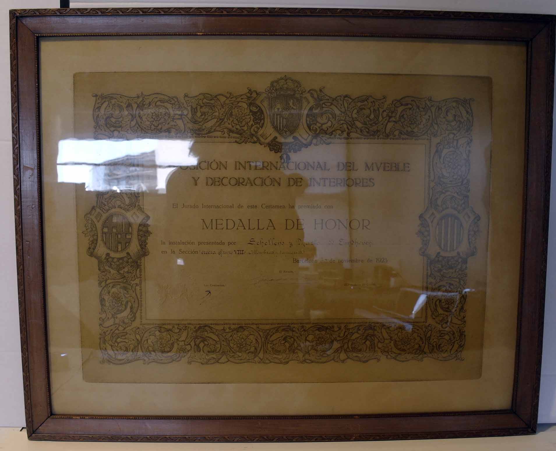 Exposición internacional de mveble y decoración de interiores... medalla de honor... por Schellens y Marto, de Eindhoven... Barcelona 30 de noviembre de 1923
