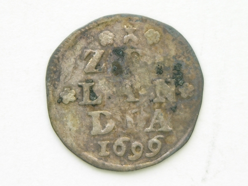 Dubbele wapenstuiver - 1699, materiaal: zilver, afmetingen: diameter 20 mm, dubbele stuiver van Zeeland gevonden onder het Kasteel van Eindhoven, zuidgracht onder Ten Hagestraat, vondsten verzameld op afgevoerde grond langs spoor ten noorden van de Waterkantstraat, augustus 1991 - oktober 1991 behorend bij vondstnummer EHV-RD-91 TH