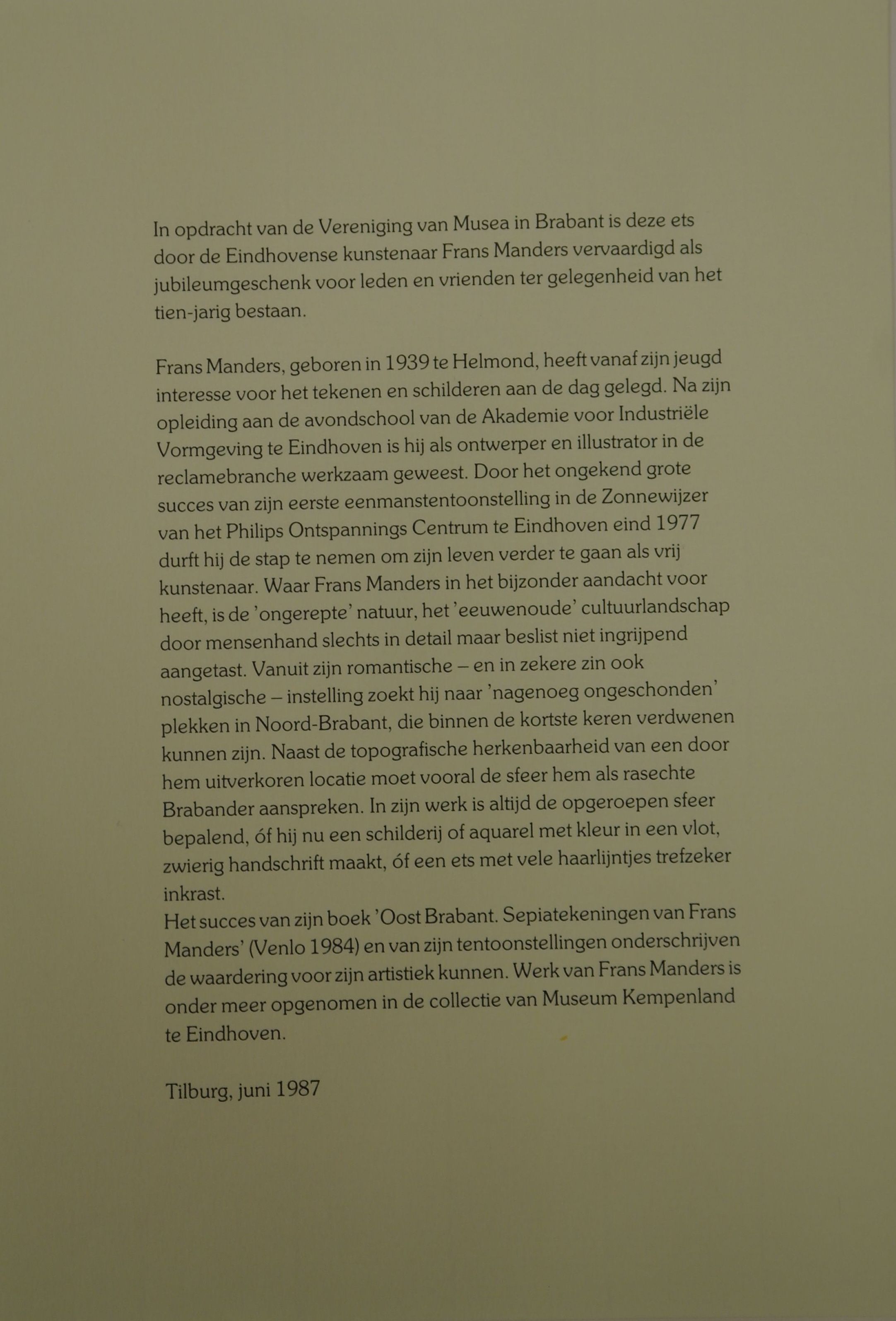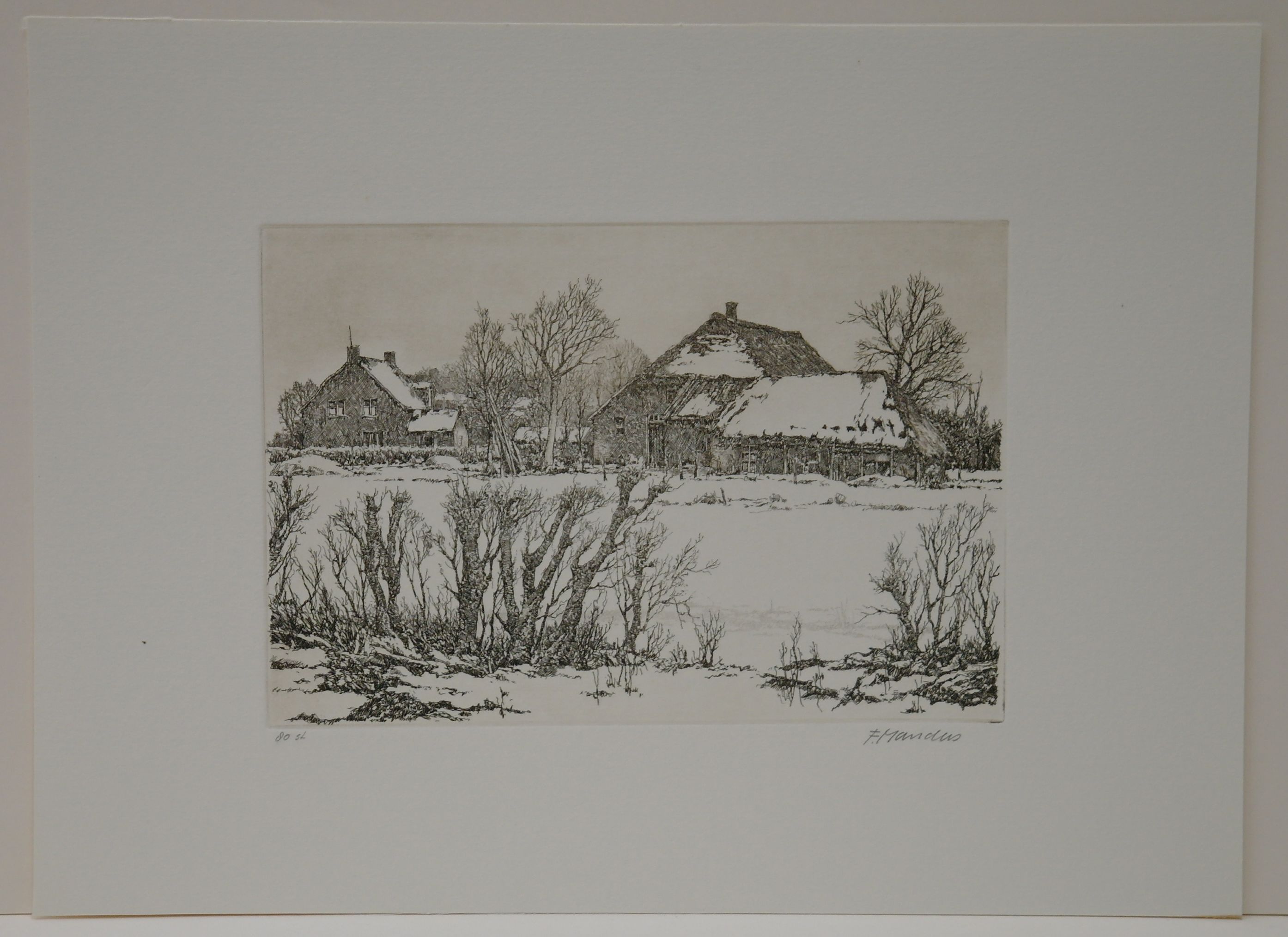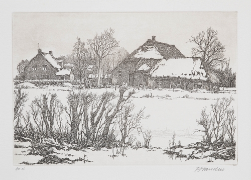 Boerderij te Leende in de winter - 1987, ets in bruin/papier, 148 x 219 mm, genummerd in potlood onder plaat l.o: 80 st, gesigneerd in potlood onder plaat r.o: F.Manders Boerderij te Leende in de winter - 1987, ets in bruin/papier, 14.8 x 21.9 cm, genummerd in potlood onder plaat l.o: 80 st, gesigneerd in potlood ...