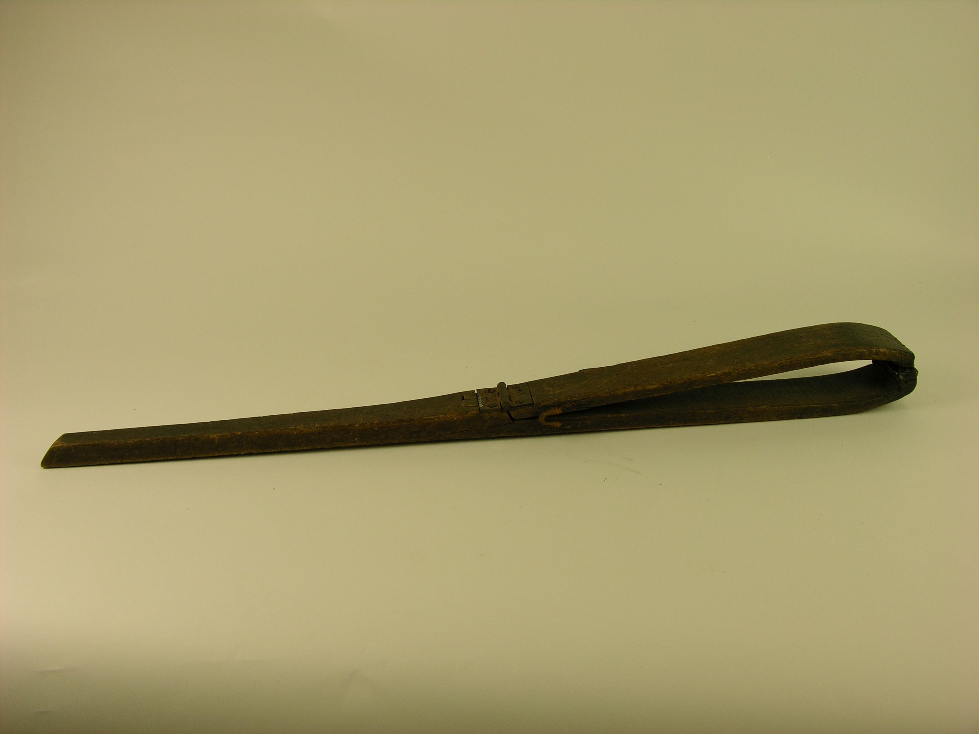 Naaispan; materiaal: hout, ijzer en leder, gereedschap gebruikt in de zadelmakerij, klem om twee lederen delen op elkaar te klemmen tijdens het stikken van de twee lederen delen. Stuk gereedschap dat op één plaats kan scharnieren door middel van een ijzeren scharnier. dit scharnier bevindt zich ongeveer op de helft van de lengte. Een lederen ...