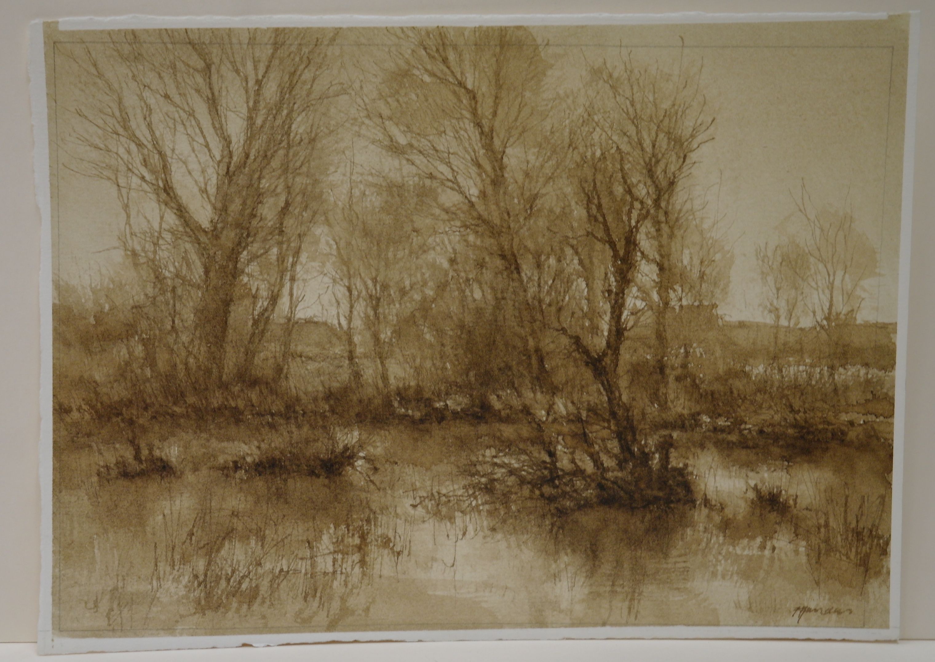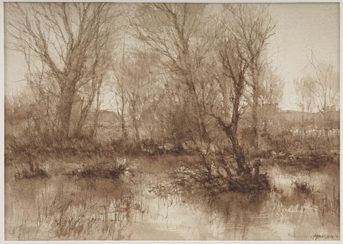 Kweekvijvers in Valkenswaard bij Venbergse molen - 1982/1984, sepia/papier, 250 x 350 mm, gesigneerd r.o.: FManders
