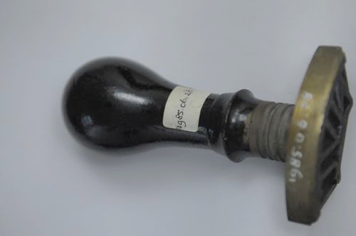 Stempel Vleeskeuring - 1e helft van 20e eeuw, hout en messing, afmetingen: 12,5 x 6,8 x 3,5 cm, boogvormig keuringsstempel met het opschrift 'NVC' en de inscriptie: NSA