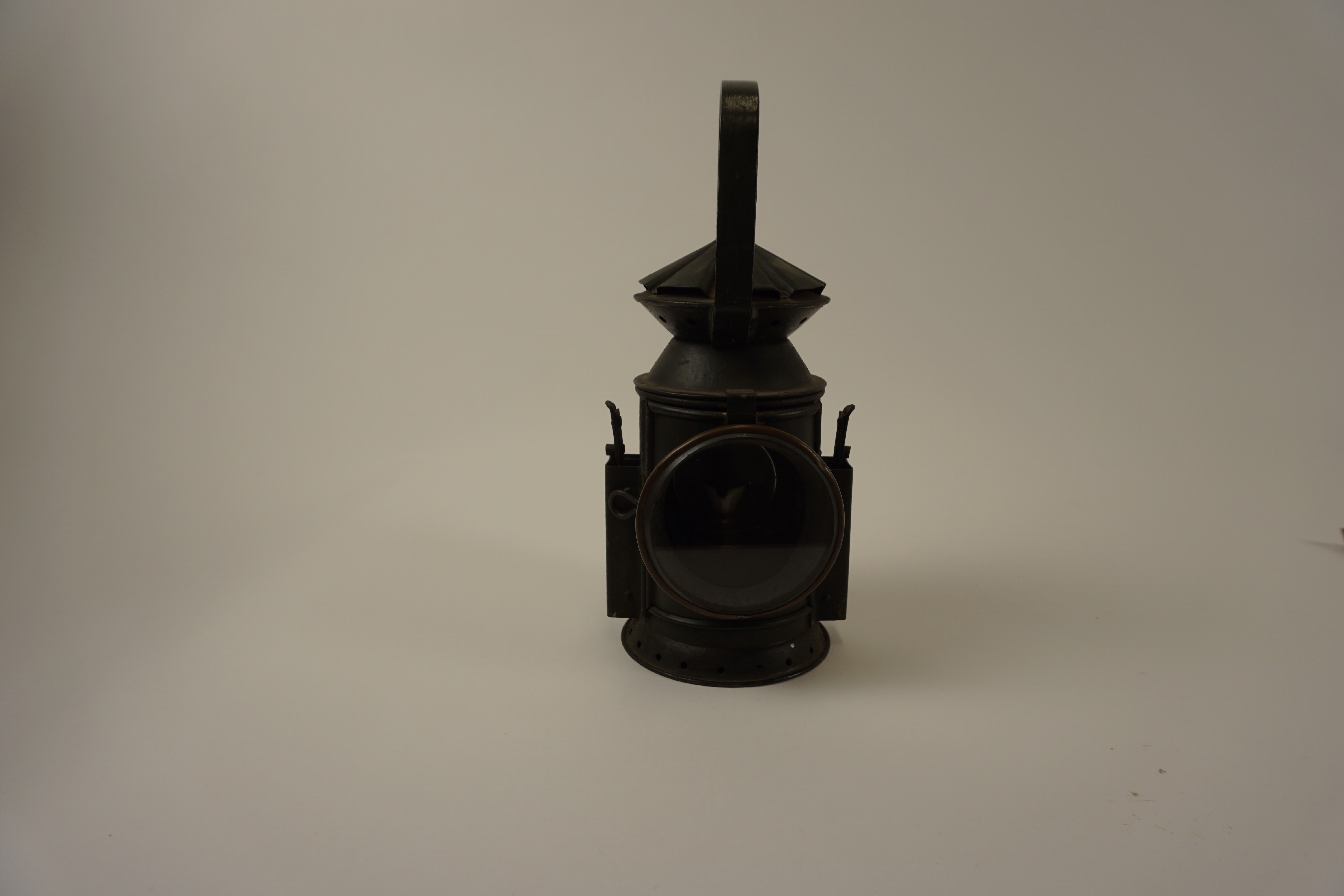 seinlamp, spoorweglamp in groen-bruin gespoten metaal; scharnierend rond venstertje, staand handvat