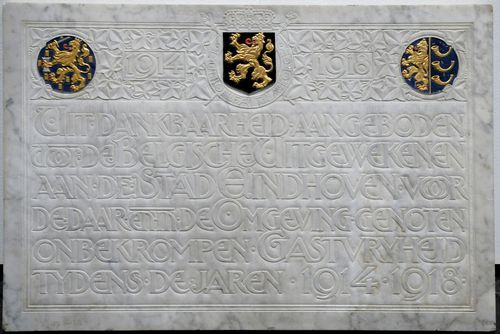 Gedenksteen, uit dankbaarheid aangeboden door de Belgische uitgewekenen aan de stad Eindhoven, voor de daar en in de omgeving genoten onbekrompen gastvrijheid tijdens de jaren 1914-1918, afb. van wapens v.l.n.r. Nederland, België, Eindhoven, waartussen '1914-1918' Deze steen is uit dankbaarheid aangeboden door de Belgische vluchtelingen in de Eerste Wereldoorlog, echter nimmer geplaatst in Eindhoven Productie reden: In ...