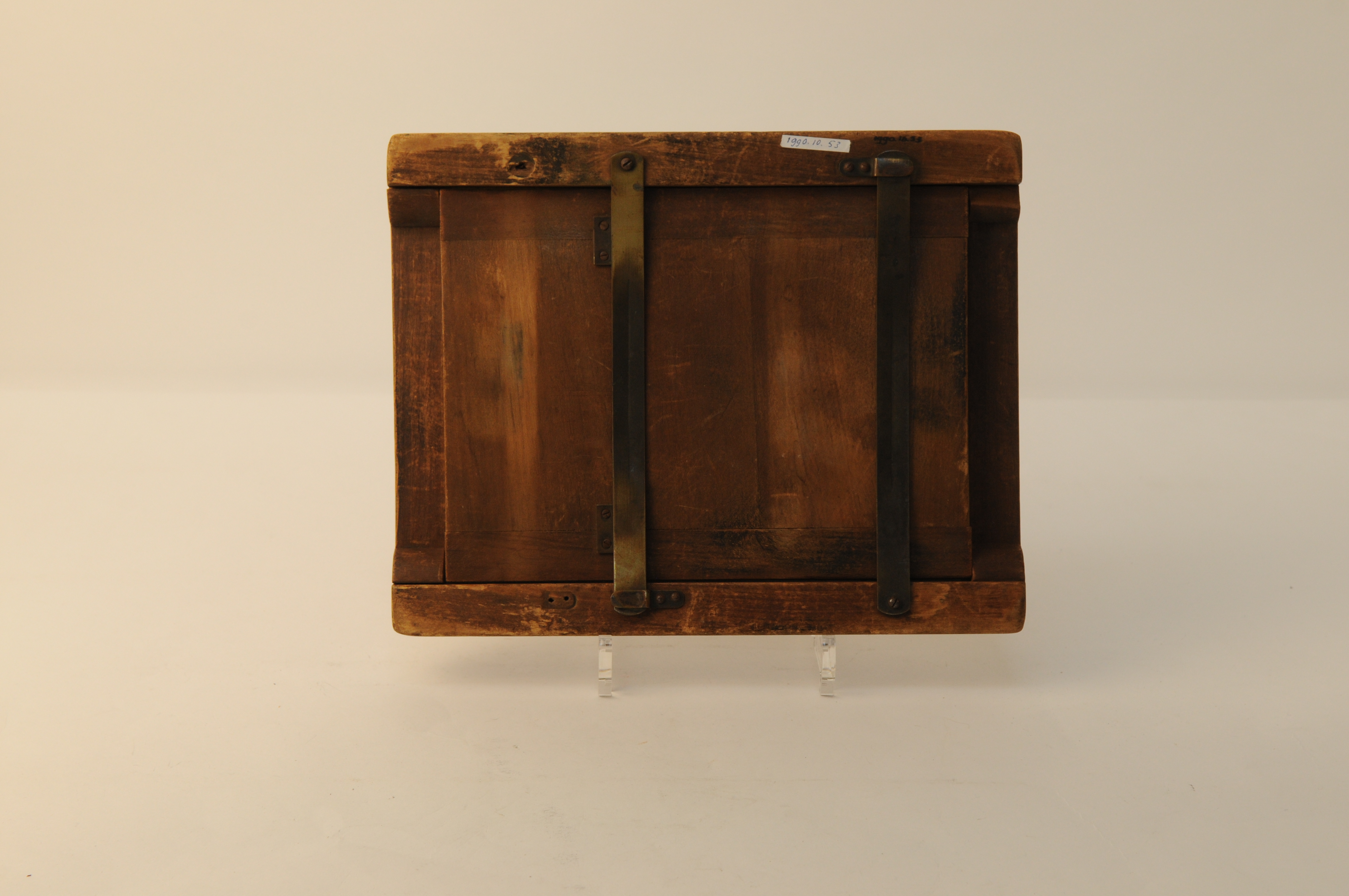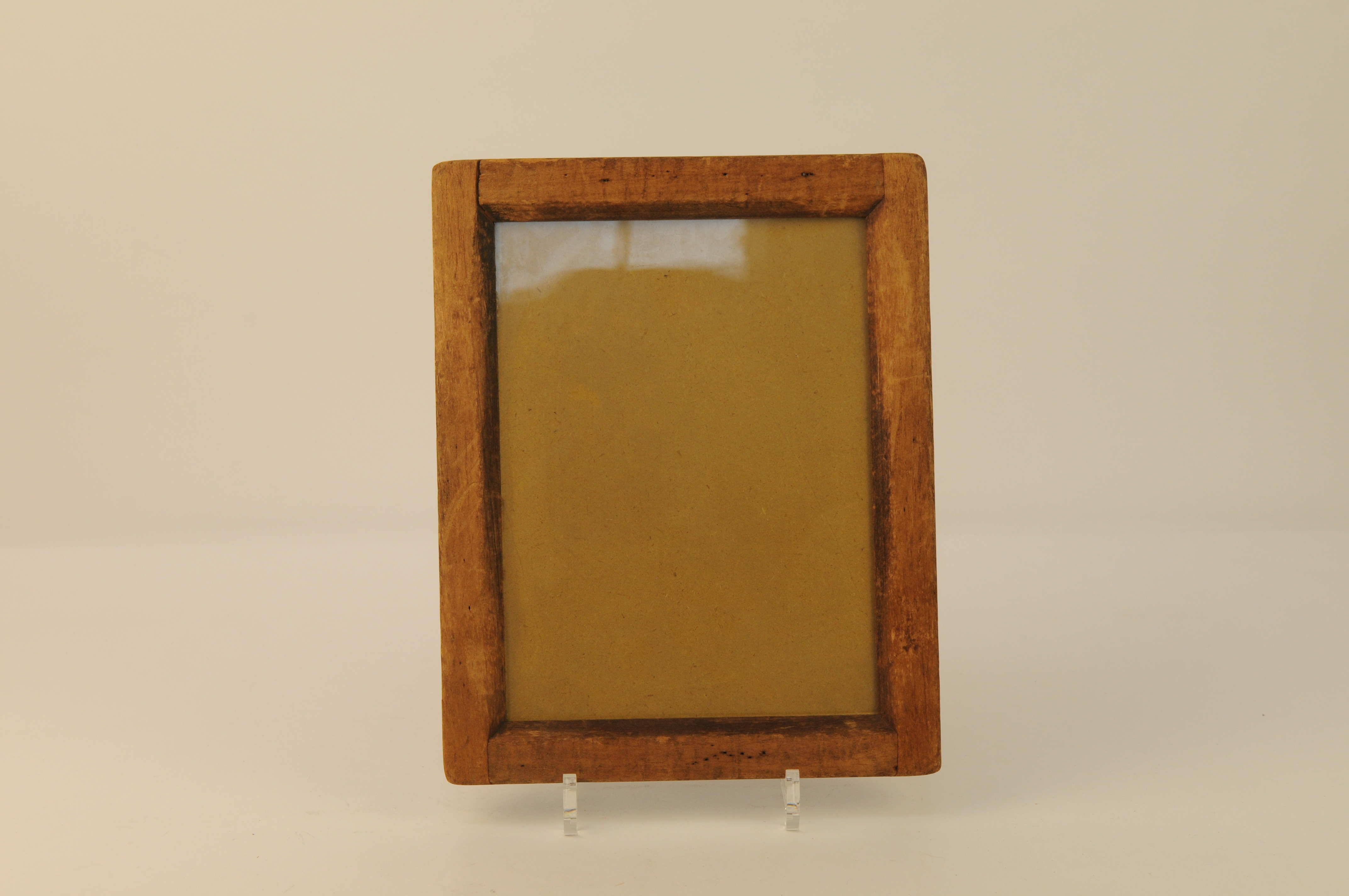 Een fotocontactraampje in de vorm van een glasplaat binnen een houten lijst met beugeltjes aan de achterkant. Een fotocontactraam werd gebruikt bij de ontwikkeling van een glasnegatief. één van beide klemmen is verplaatst of vervangen door een nieuwe