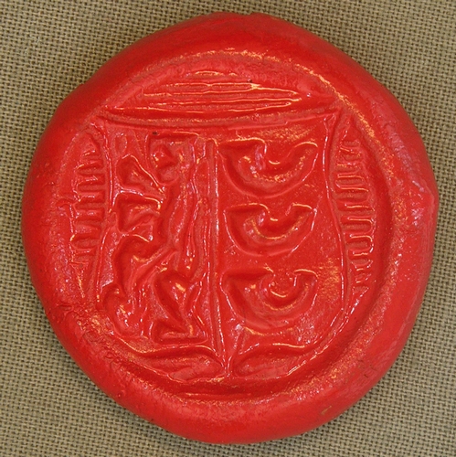 Ronde eenzijdige penning van met rode glansverf beschilderd gebakken aardewerk , diameter 39 mm, randdikte 9 mm. Afbeelding van het stadswapen van Eindhoven; schild met links de Brabantse leeuw en rechts de drie hoorns van Horne