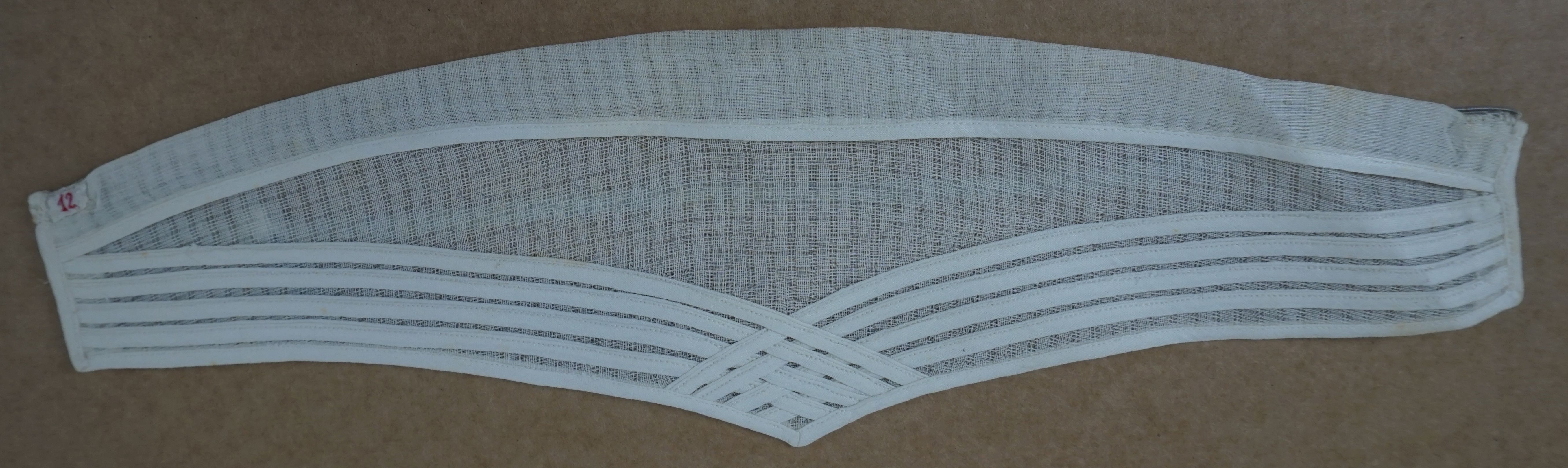 Haarband voor dienstbode, materiaal: batist, kleur: wit, lengte 28,5 cm, hoogte 7,5 cm, wit geweven batist, rondom omgezoomd met smalle band, vier banden opgestikt, in punt verwerkt, elastiek verbonden, wasmerkje 12, confectie