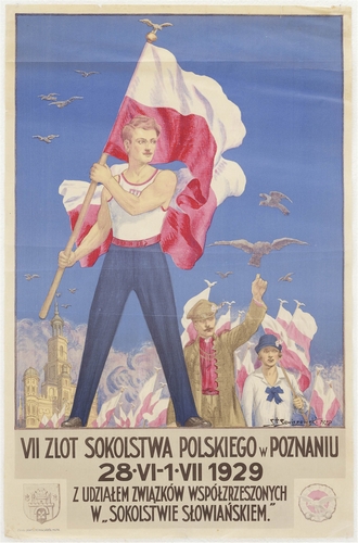 Affiche VII Zlot sokolstowa Polskiego w Pozaniu 28. VI - 1. VII 1929 z udzialem zwiazkow wspolzrzeszonych w 'sokolstwie slowianskiem', afbeelding van vlaggendragers (tijdens de Poolse Onafhankelijkheidsstrijd, 1919 -1920 ?) gedrukt onderschrift; zakl. graf. L. Nowak, Krol - Huta, gesigneerd en gedateerd in voorstelling r.o.: St. Sawiczewski 1928, Polychromolithografie Affiche VII Zlot sokolstowa Polskiego w Pozaniu ...
