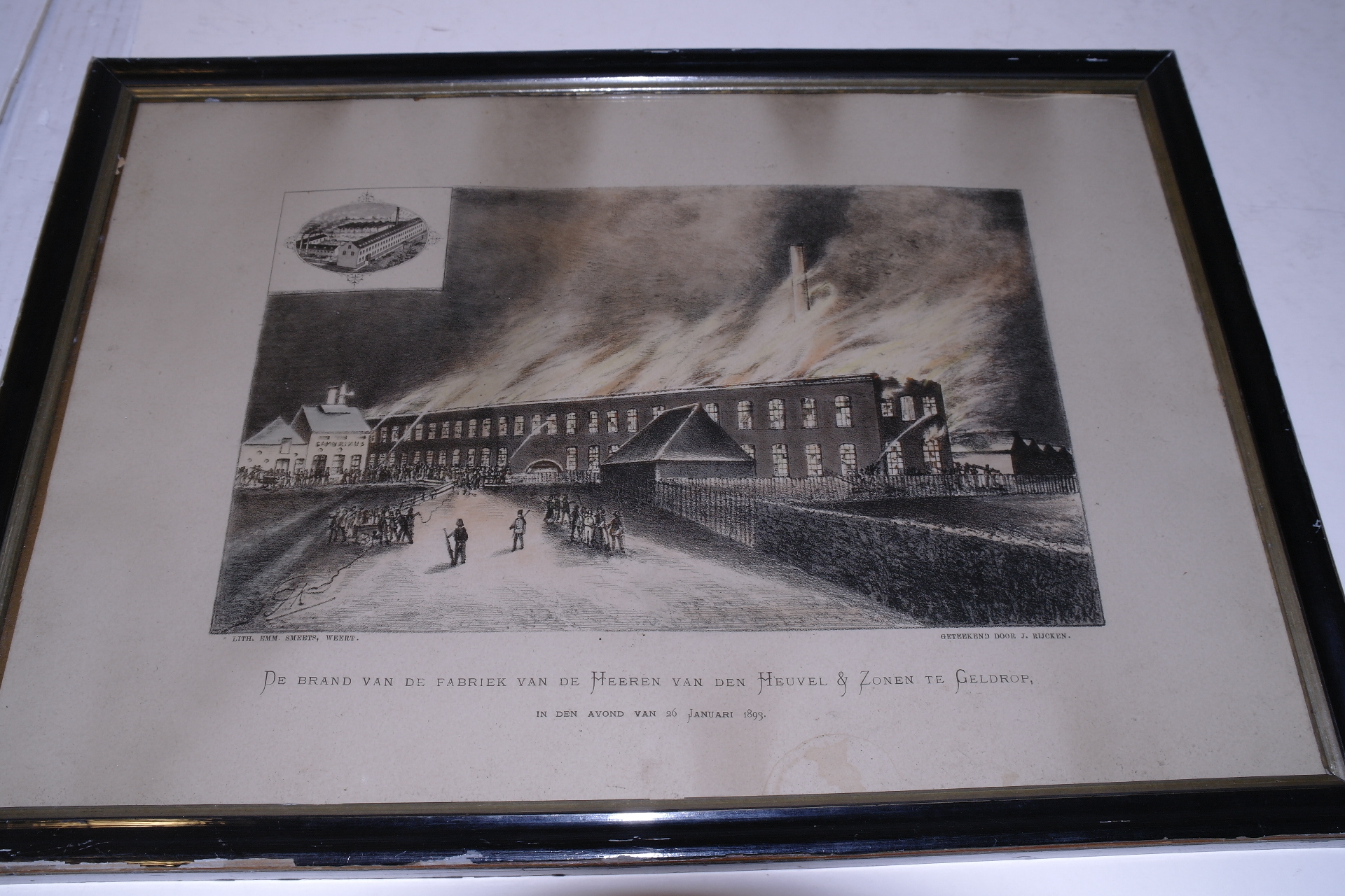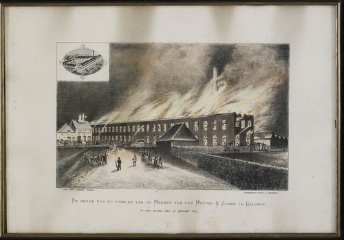 De brand van de fabriek van de Heeren van den Heuvel en Zonen te Geldrop, in den avond van 26 januari 1893, litho,deels ingekleurd, 295 x 427 mm, gesigneerd in voorstelling l.o.: J. Rijcken, geannoteerd onder voorstelling l.o.: Lith. Emm. Smeets, Weert, geannoteerd onder voorstelling r.o.:geteekend door J. Rijcken, getiteld onder voorstelling: De brand van ...