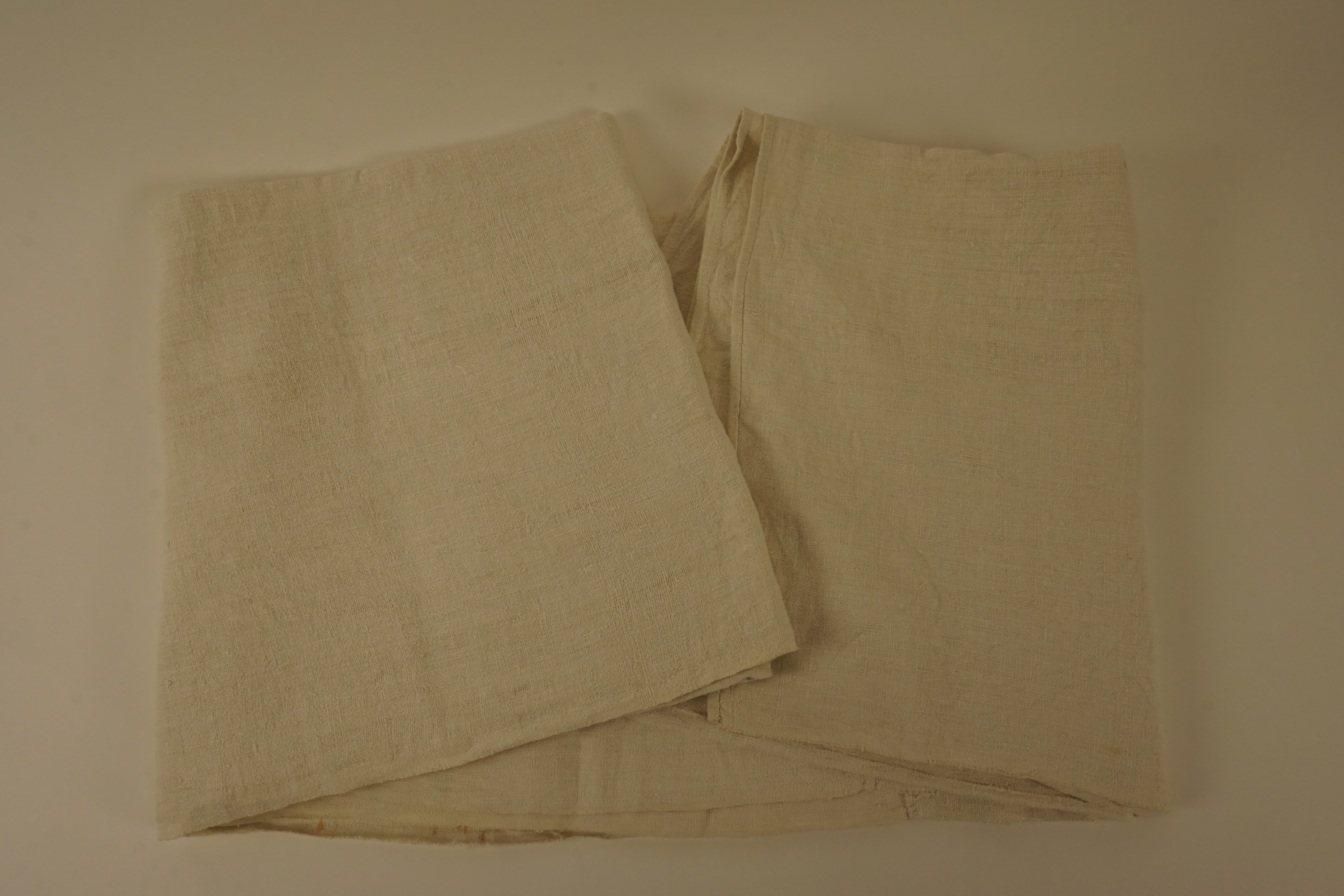 Beddenlaken, materiaal handgeweven linnen (thuisweverij), kleur ecru, verstelstukken ingenaaid, tweemaal baan vn 93 cm (weefgetouw breedte), lengte: 319 cm, breedte 186 cm, tweede helft XVIIIe – eerste helft XIXe eeuw