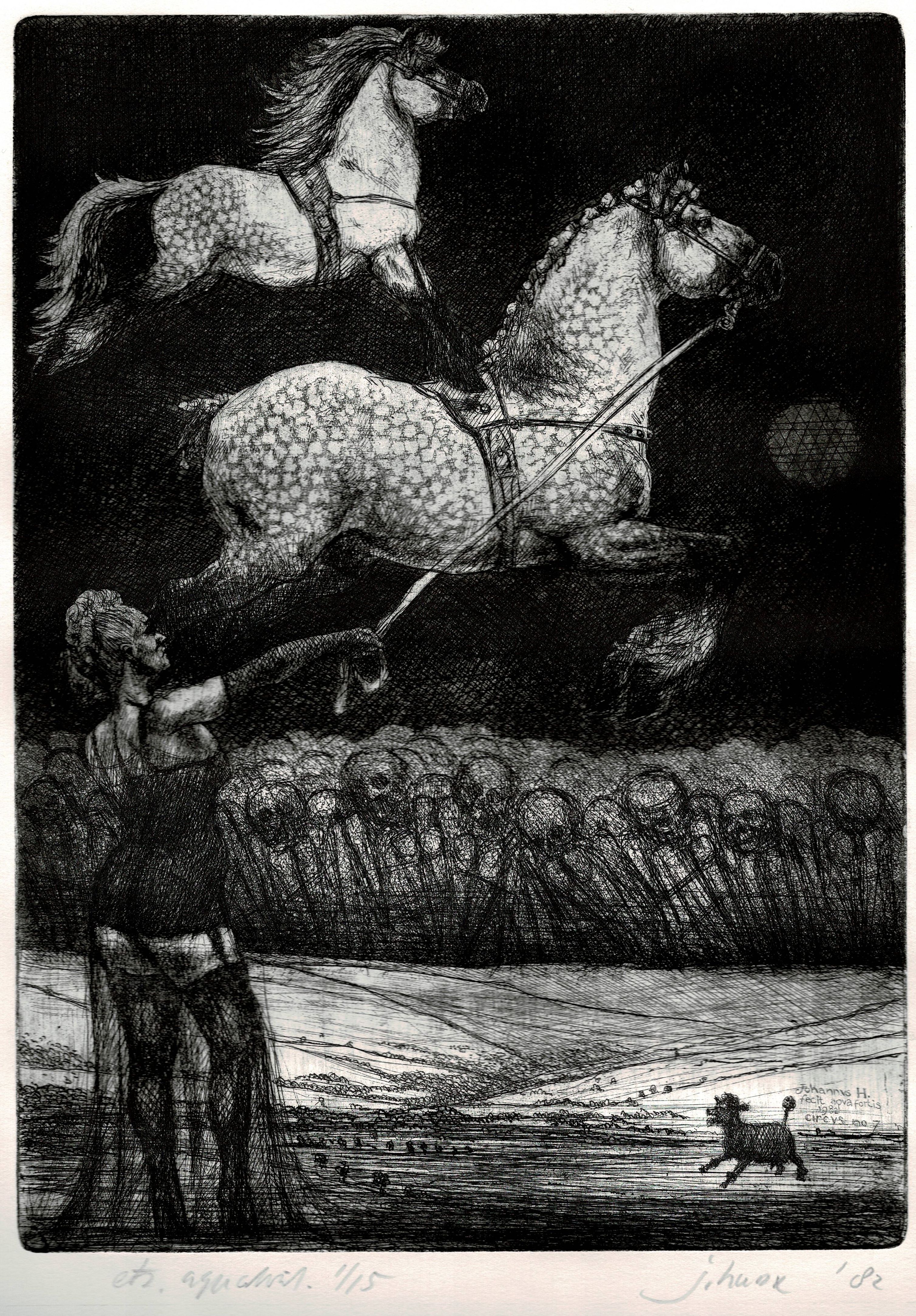 gesigneerd, geannoteerd en gedateerd in plaat r.o.: Johannvs H. fecit aqua fortis 1982 circvs no 7 gesigneerd en gedateerd in potlood onder plaat r.o.: j.hurx '82 in potlood onder plaat l.o.: ets.aquatint.1/15 in passe-partout inventarisnummer Sociale Dienst: GW 5503 bedrag BKR: onbekend