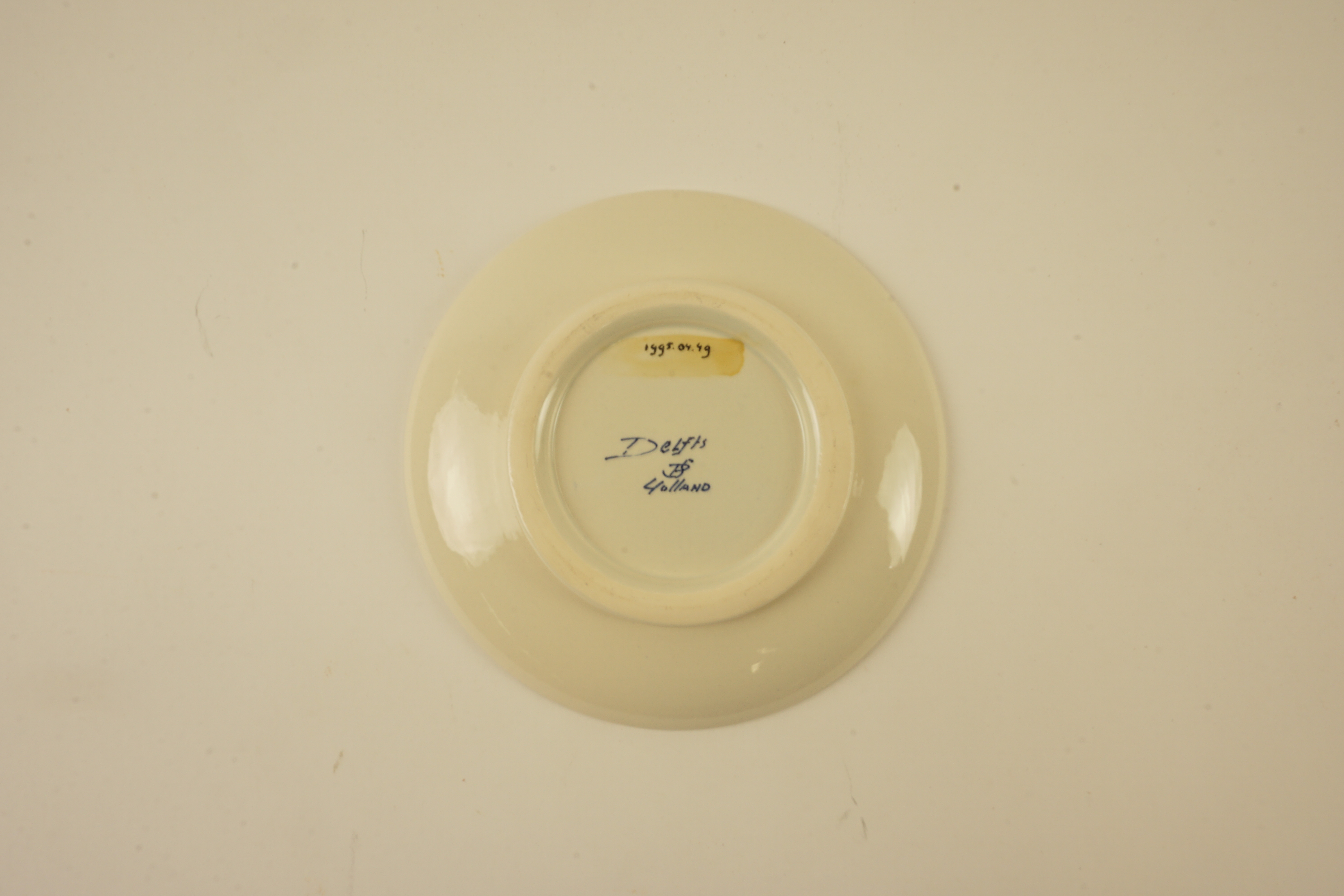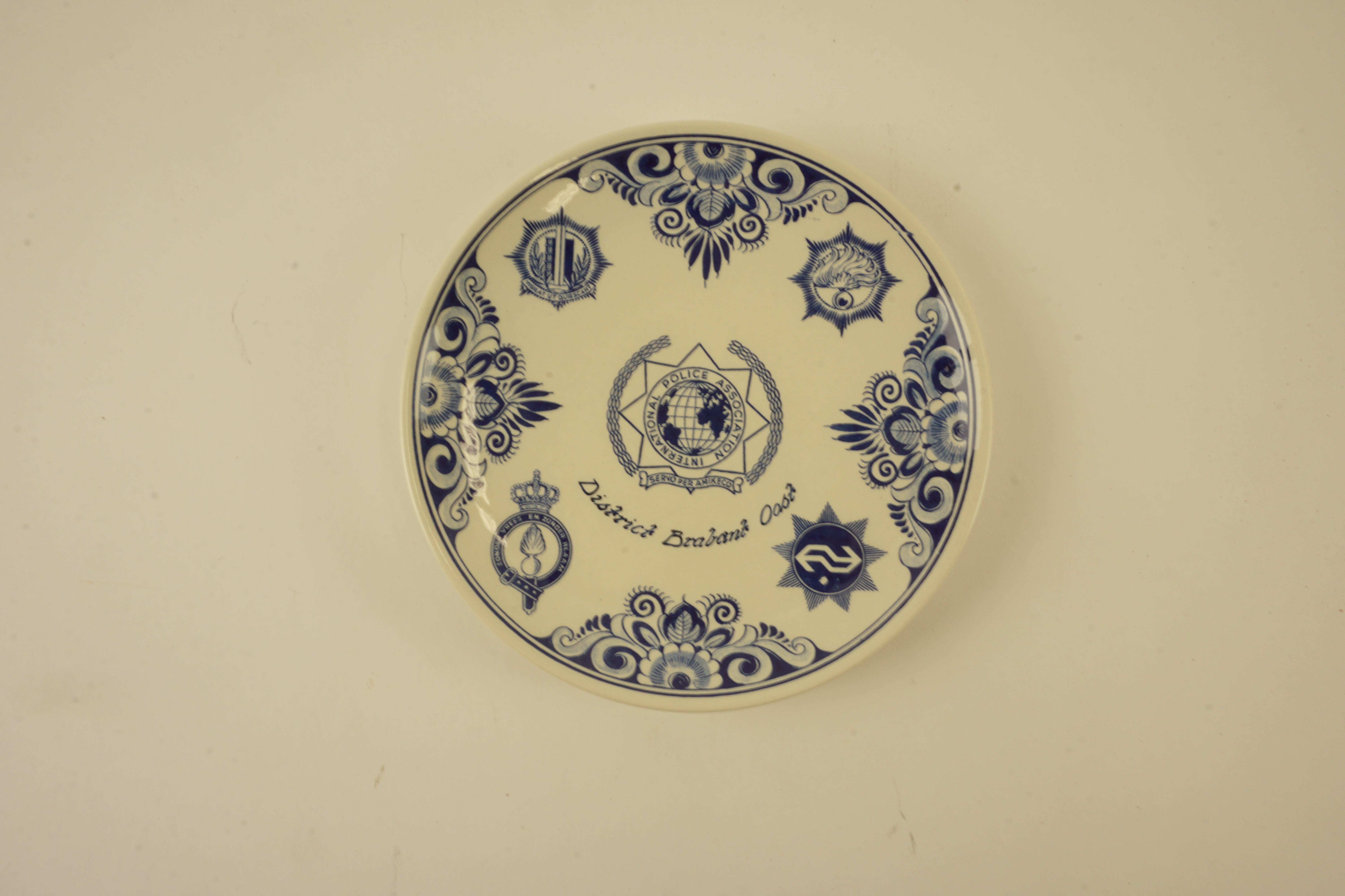Blauw-wit aardewerken bord (Delft Holland) met politie-emblemen en het opschrift: ' International Police Association District Brabant Oost'
