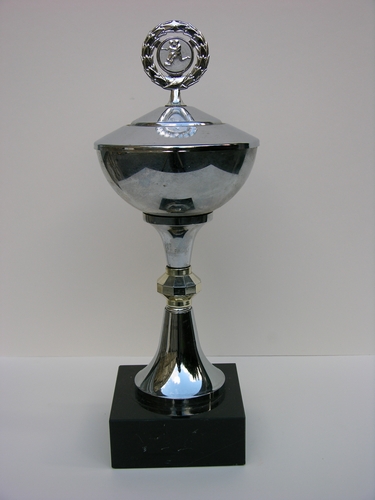 Prijsbeker voetbalvereniging RKSV, met (vaste) deksel bekroond door medaillon, waarop twee voetballers zijn afgebeeld omgeven door een lauwerkrans. Voetstuk van zwarte kunst(marmer)steen. Opm: tekstschildje voorzijde is verwijderd Prijsbeker voetbalvereniging RKSV, met (vaste) deksel bekroond door medaillon, waarop twee voetballers zijn afgebeeld omgeven door een lauwerkrans. Voetstuk van zwarte kunst(marmer)steen.Materiaal: kunststeen, plastic en metaal (deels verchroomd), hoogte ...