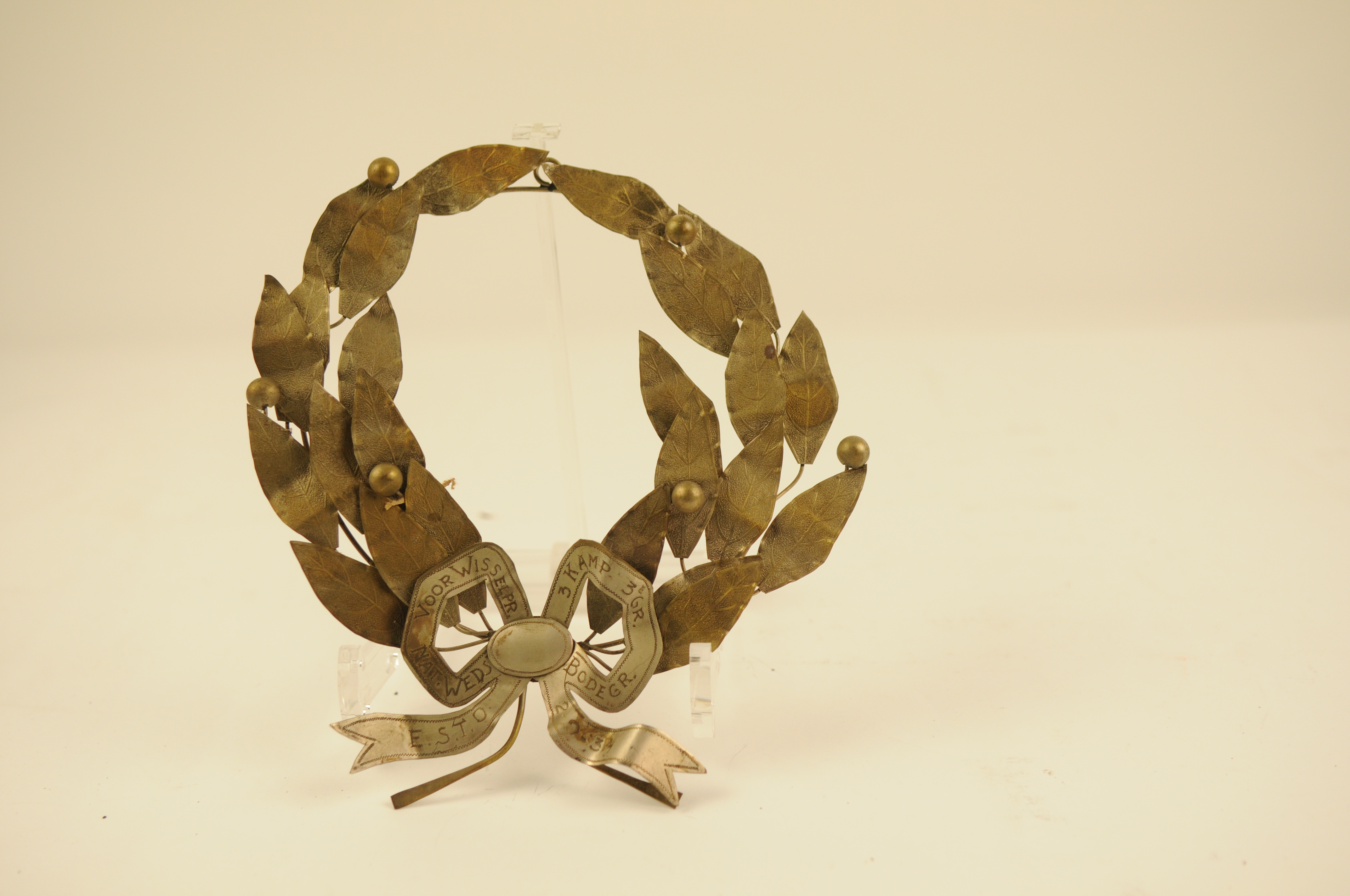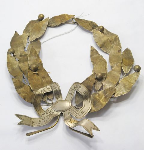 Lauwerkrans - 1934, materiaal: metaal, verzilverd, afmetingen: 19 x 18 x 2 cm, 24-bladige lauwerkrans met zes vruchten, symmetrisch uitgewerkt banderole-lint met de inscriptie: ‘E.S.T.O. NAT. WEDST. VOOR WISSELPR. 3 KAMP 3 GR. BODEGR. 2-9-‘34’