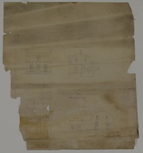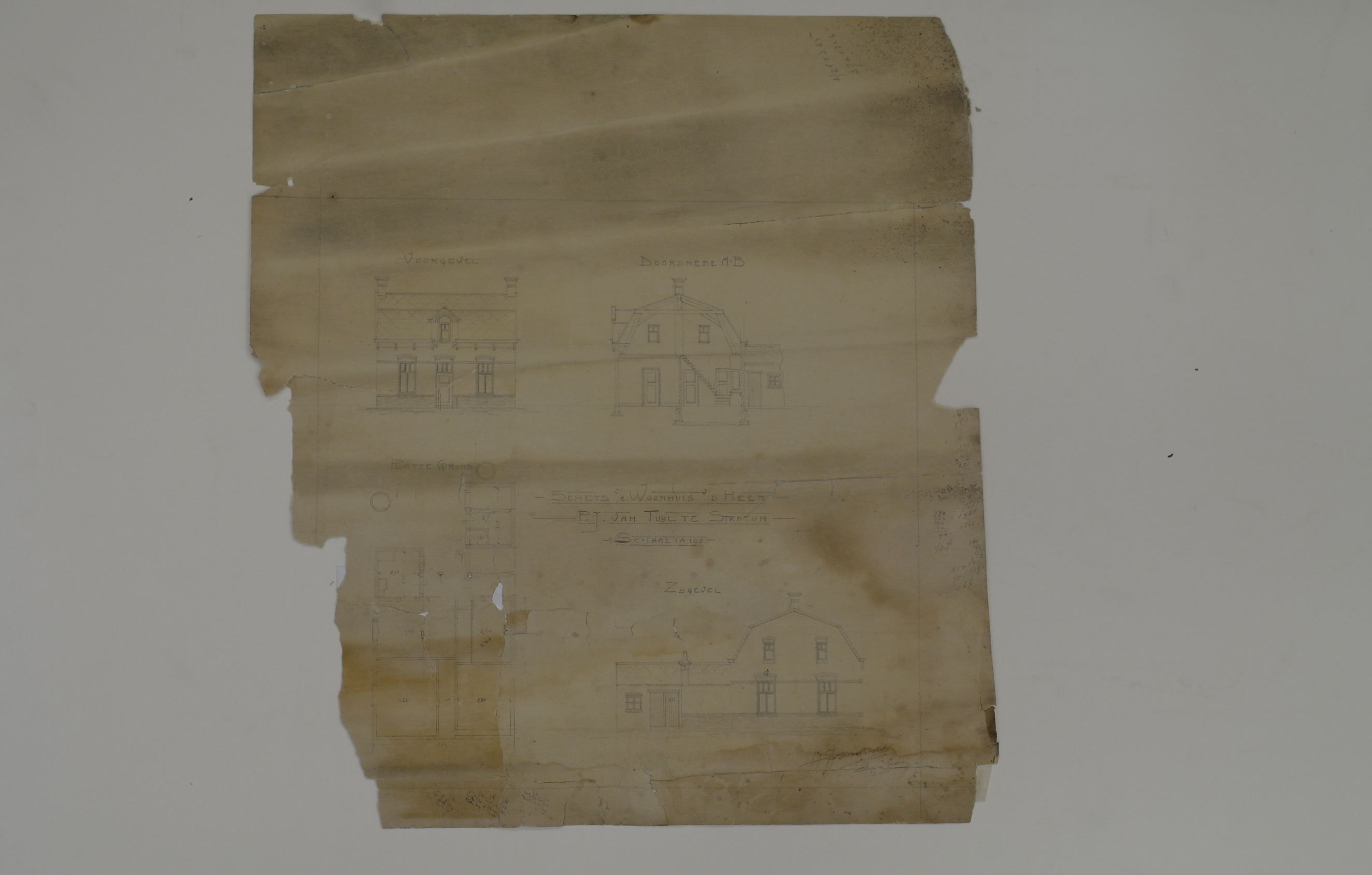 schets, tekeningen van een woonhuis voor de heer P.J. van Tuijl te Stratum geannoteerd in potlood: schets v/e Woonhuis v/d Heer P.J.van Tuyl te Stratum Schaal 1 a 100 in map de Bouwkunidge Vakken toont voorgevel, zijgevel, plattegrond en doorsnede signatuur van de architect onleesbaar