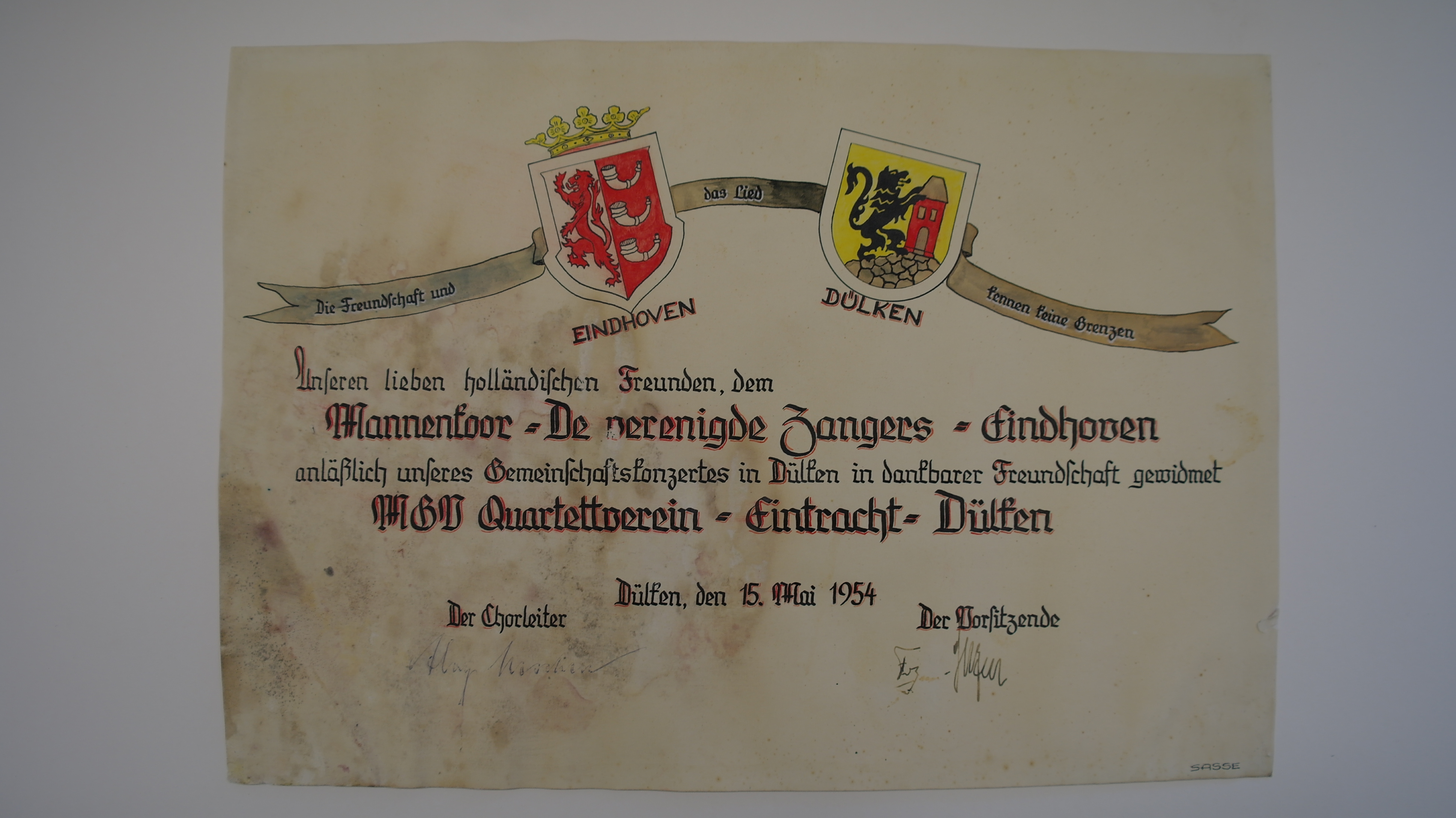 Oorkonde mannenkoor De verenigde Zangers - 1954, materiaal: inkt en aquarel/papier, afmetingen: 312 x 445 mm, een oorkonde in het Duits naar aanleiding van een gezamenlijk optreden van het mannenkoor 'De verenigde Zangers' uit Eindhoven en de 'Quartettverein Eintracht' uit Dülfen, als blijk van vriendschap, gesigneerd in inkt r.o.: sasse Oorkonde mannenkoor De verenigde Zangers - ...