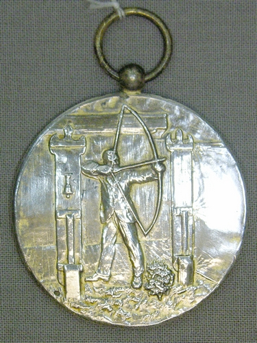 Prijsmedaille handboogschutterij, materiaal: verzilverd koper, ronde prijsmedaille met doorboord knopje en draagringetje, recto: reliëfafbeelding van handboogschutter richtend op doelwit, verso: inschrift '3e Pr. C. De Dageraad Vught 1863 - 1938' (in kapitalen) boven deelstreep omlopende lauwerkrans langs rand, beneden deelstreep 'Je Maintiendrai' met twee leewuwnfiguren die gekroond wapen torsen, in het wapen een staande leeuw ...