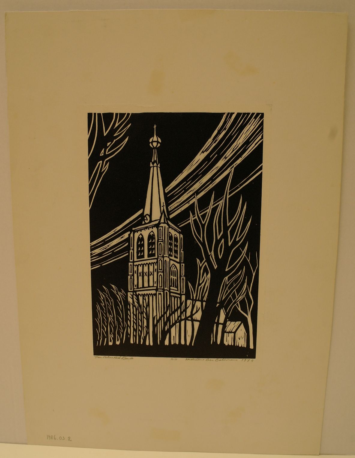 Toren Petruskerk te Leende - 1974, linosnede/japans papier (No 11), 304 x 208 mm, gelocaliseerd in potlood onder afbeelding l.o.: Toren Petrus Kerk Leende, genummerd in potlood onder afbeelding m.o.: no 11, geannoteerd, gesigneerd en gedateerd in potlood onder afbeelding r.o.: Handdruklino Bas Bakermans 1974 uit het bezit van A. Jansen te Geldrop