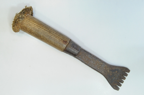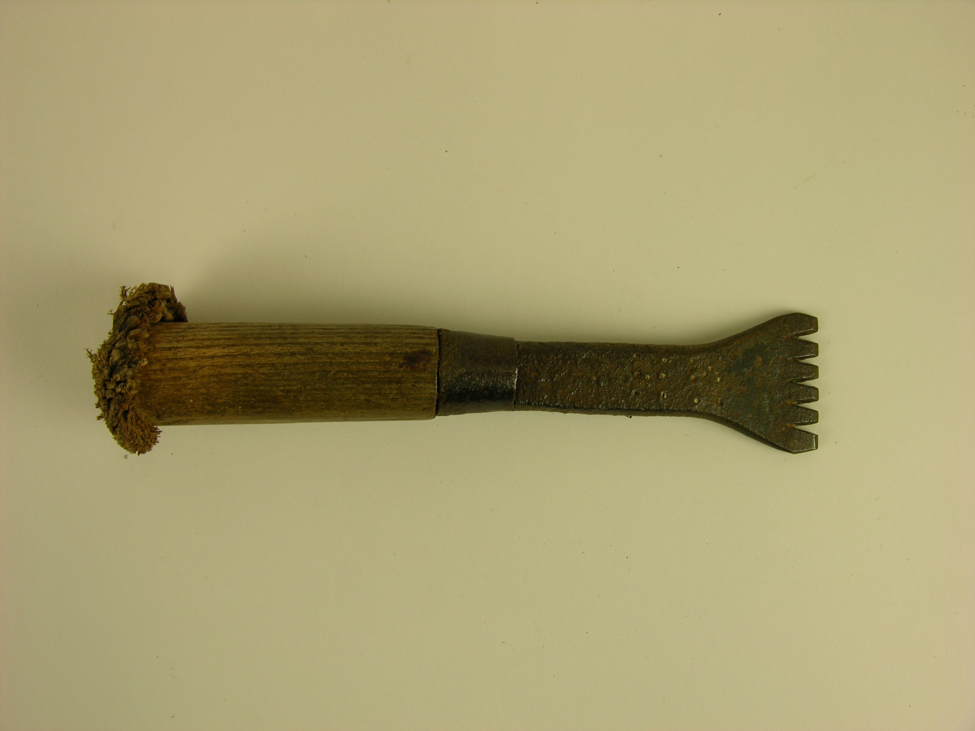 Platte zestandige beitel met houten handvat, gemerkt 'H M', steenhouwersgereedschap
