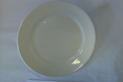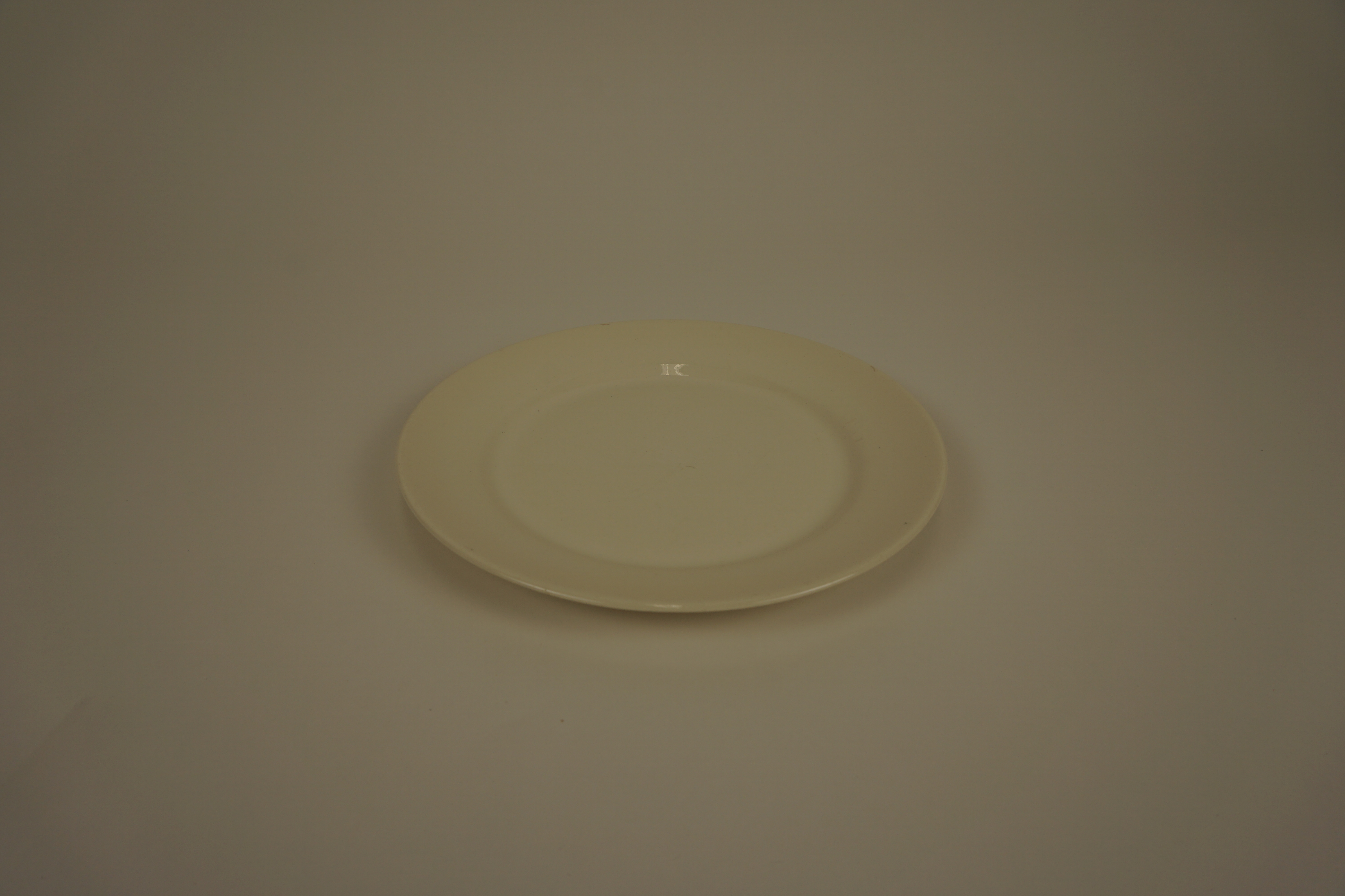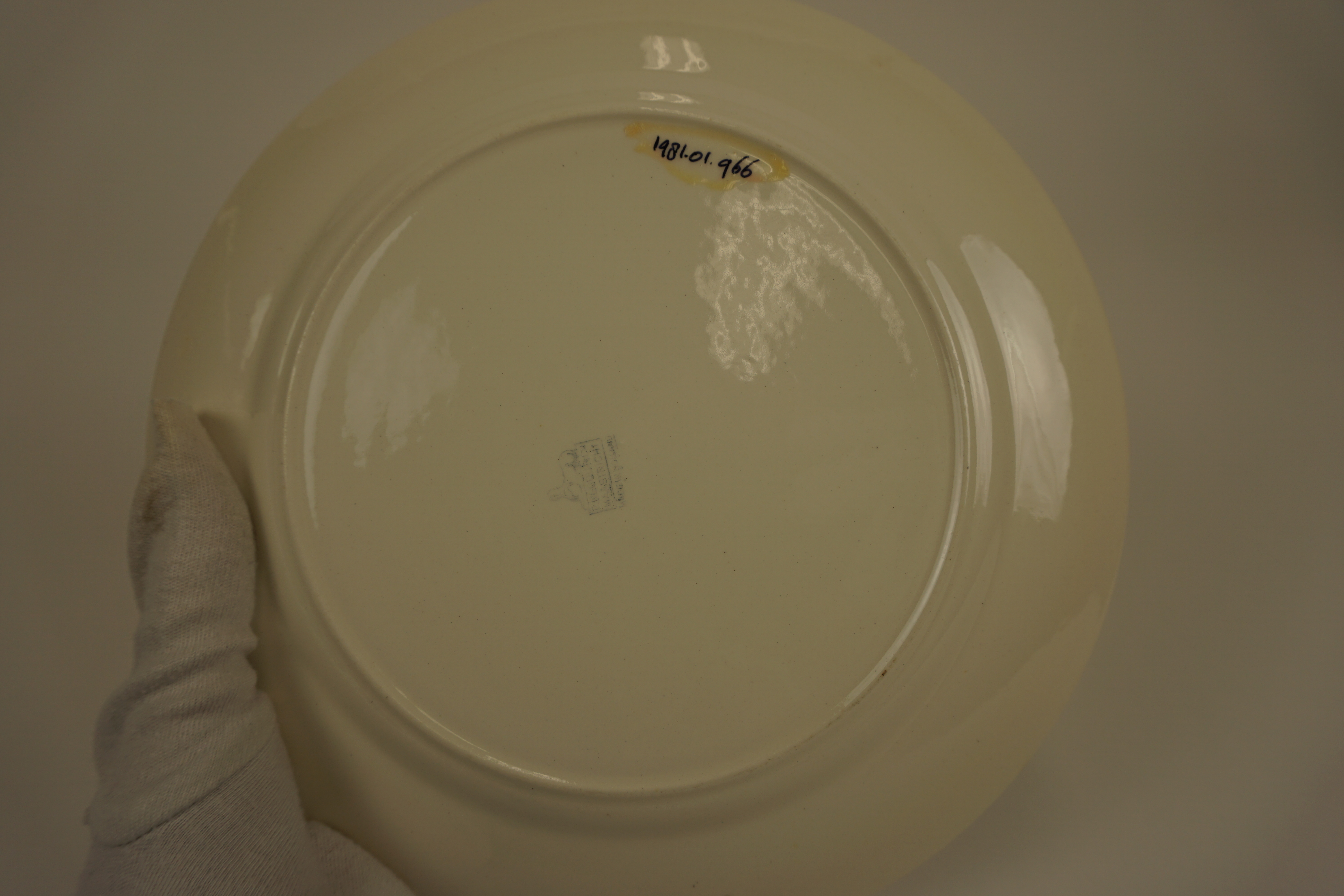 Plat bord - eerste helft van 20e eeuw, witbakkend geglazuurd aardewerk, afmetingen: 2,5 x 23,5 cm, op de onderzijde van de bodem gemerkt: 'P. Regout en Co Maastricht (in kader) Made in Holland' gemerkt: P. Regout en Co Maastricht (in kader) Made in Holland