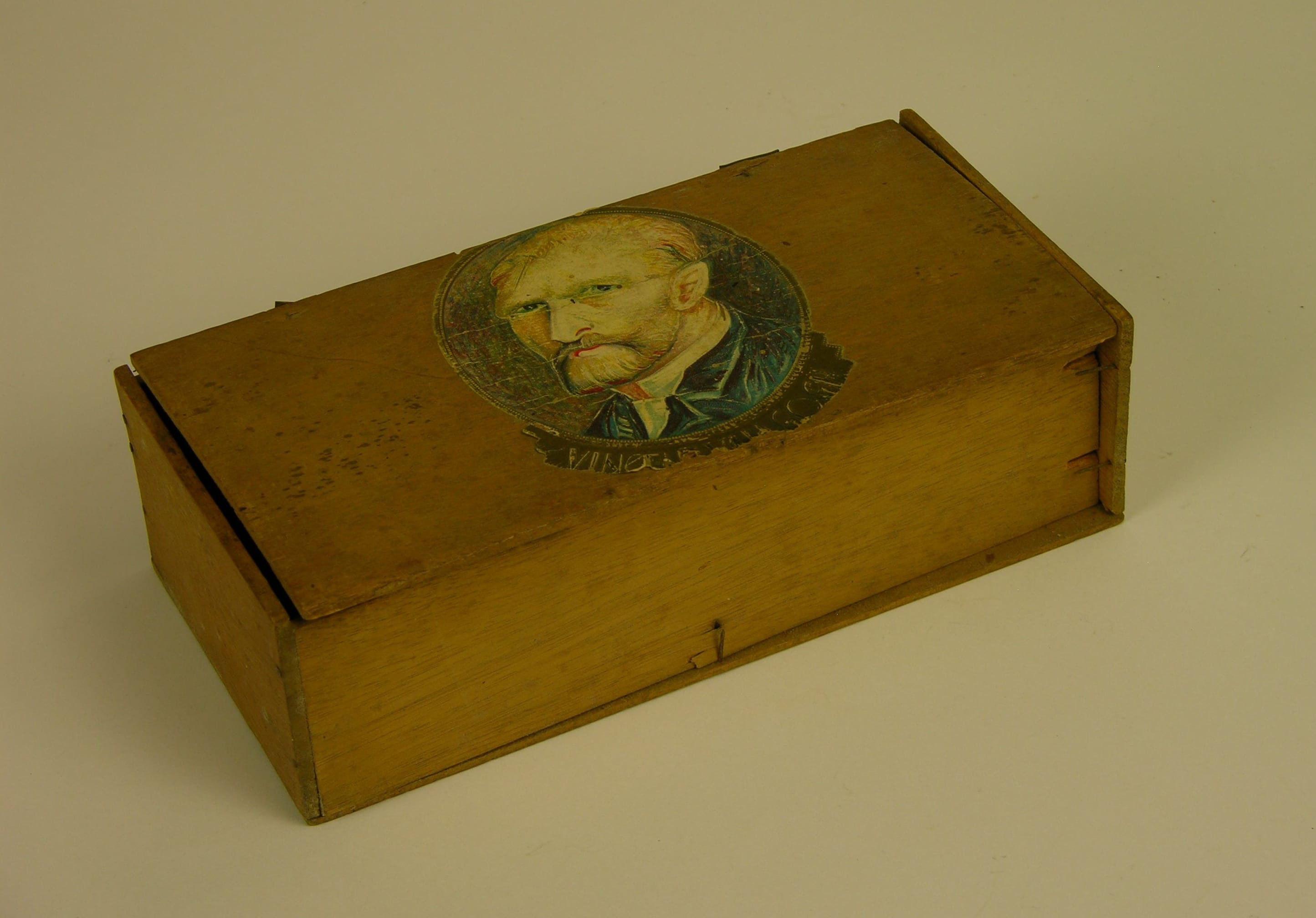 Sigarenkistje 'Vincent van Gogh' - 2e t/m 3e kwart van de 20e eeuw, materiaal: hout, metaal, chromolithografie/papier en tabak, afmetingen: 6 x 20,8 x 10,4 cm, op het (losse) deksel een lithografisch portretmedaillon met een portret van Vincent van Gogh (sleets, naam onderschrift slecht leesbaar), accijnszegel: '50 sigaren prijs f 6.50', deksel is uit de ...