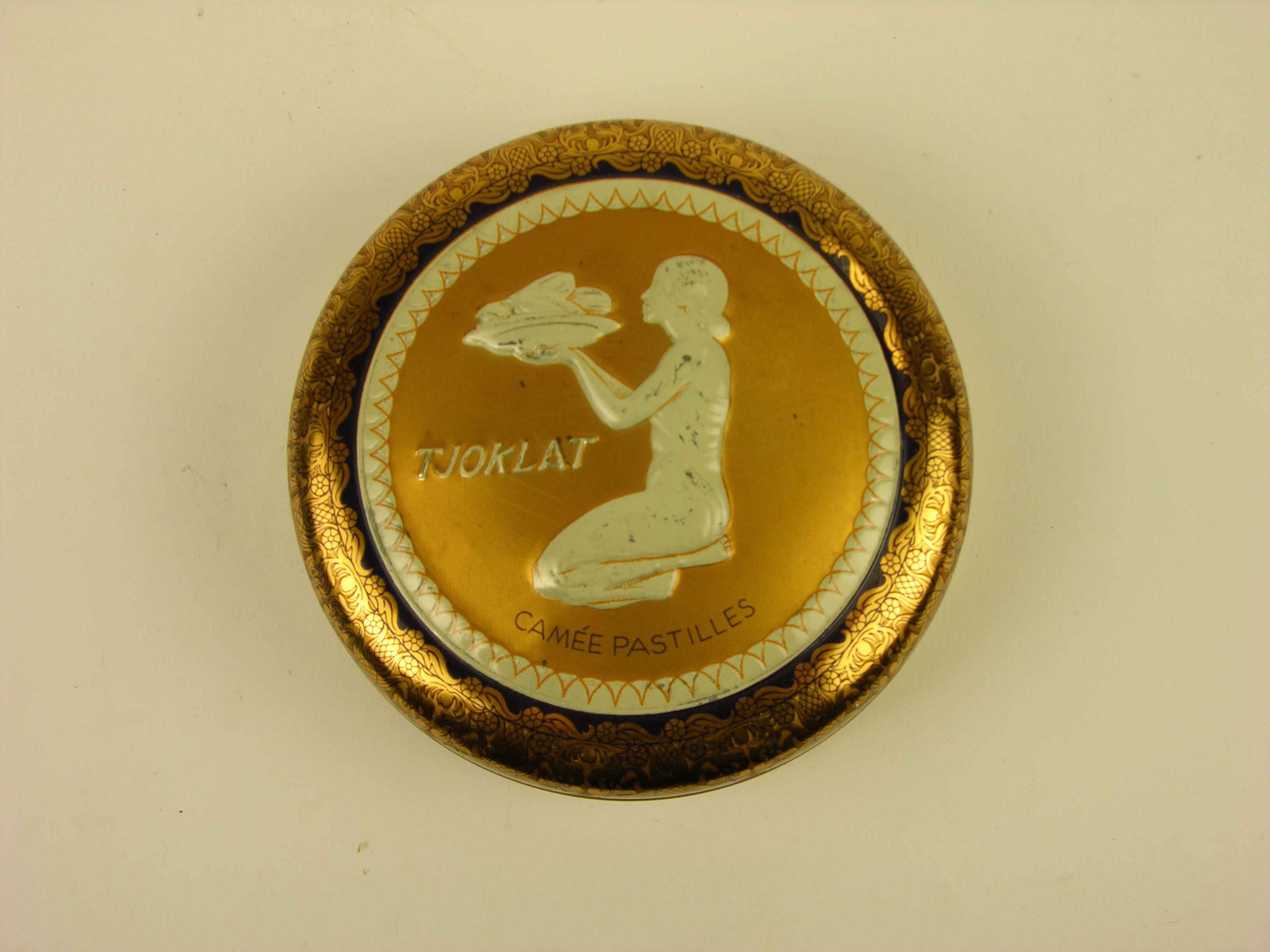 Rond blikje voor camée pastilles van het chocolademerk 'Tjoklat'. Op het deksel is een naar links gewende vrouwenfiguur afgebeeld die in in hurkzit een presenteerschaal vol chocolade in beide handen houdt.