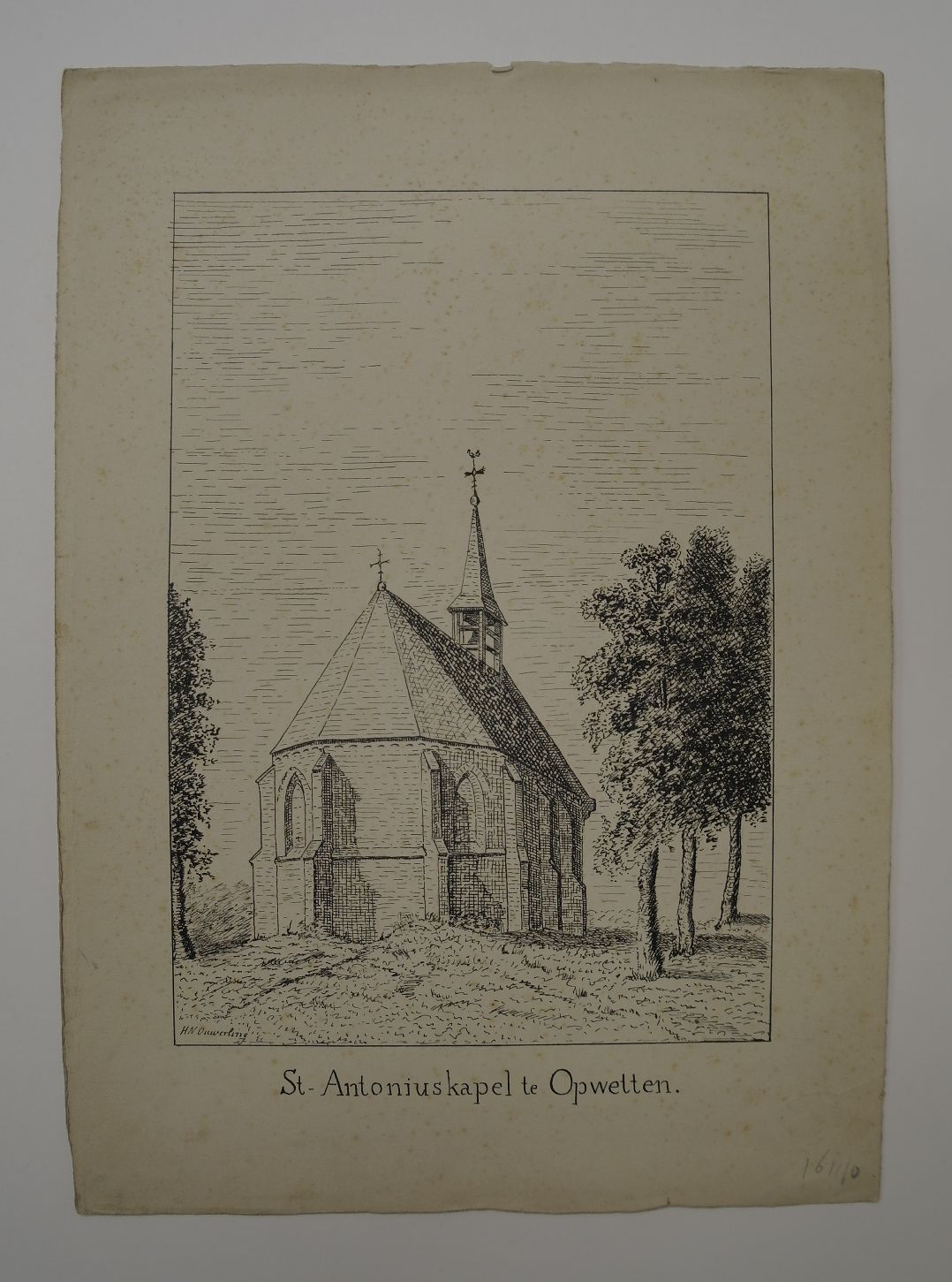 gesigneerd in O.I.-inkt l.o.: HN. Ouwerling geannoteerd in O.I.-inkt onder voorstelling: St-Antoniuskapel te Opwetten. in potlood onder voorstelling r.o. (collectie)nummer: 1611/0