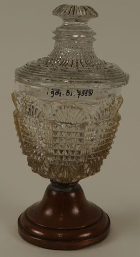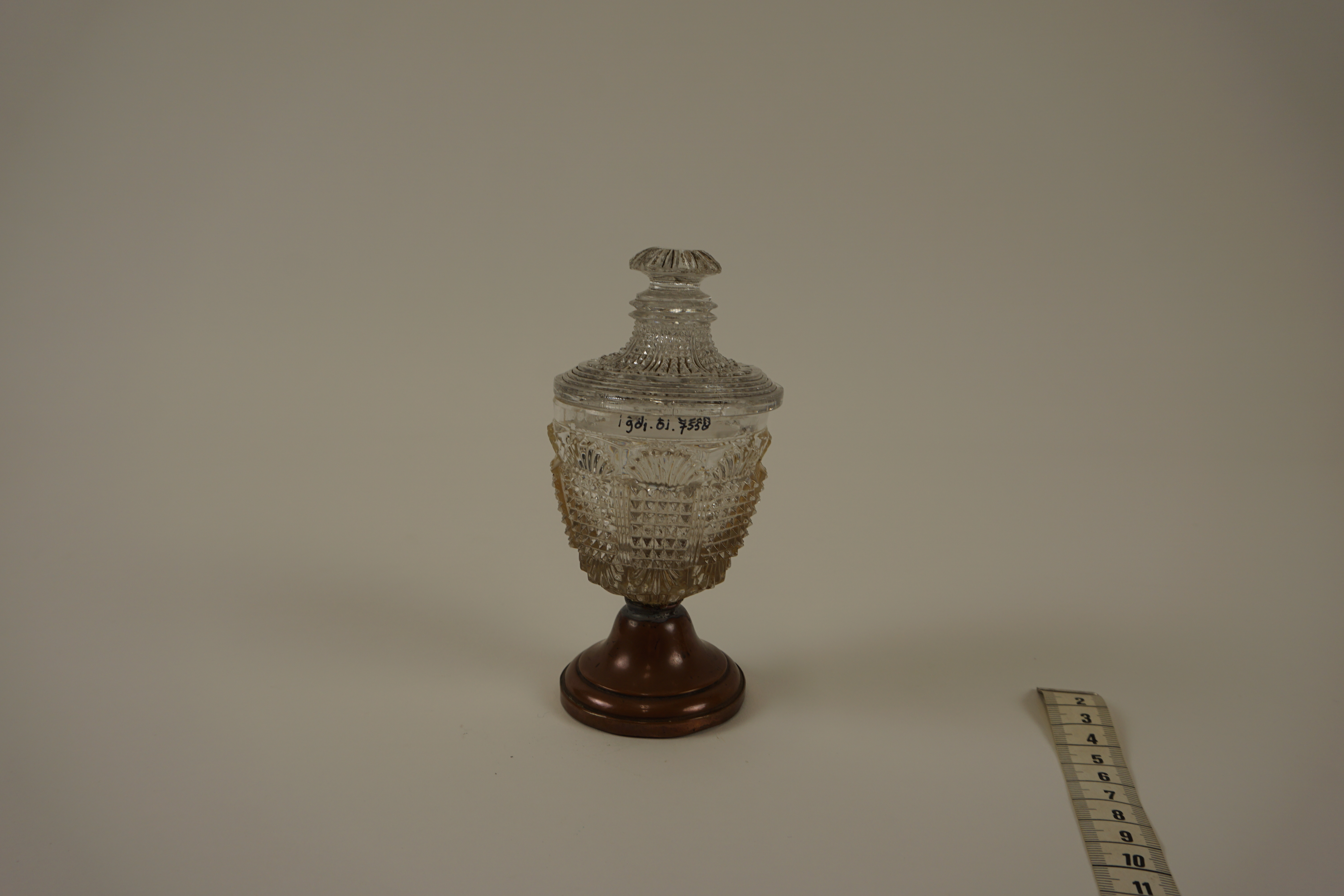Suikerpot met deksel - 1e helft van 20e eeuw, materiaal: (kristal)glas (de pot en de deksel) en metaal (de voet), afmetingen: 14,5 x 7 cm, glazen suikerpotje met metalen standvoet, met op de buitenwand een decoratief reliëfpatroon