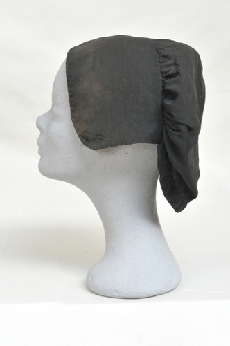Ondermuts, materiaal: merino, kleur: zwart, lengte 23 cm , breedte 30 cm, voorstrook 12 cm breed, gevoerd met katoen, bol ongevoerd, is verstevigd met losse kartonnen bodem, muts is met de hand genaaid
