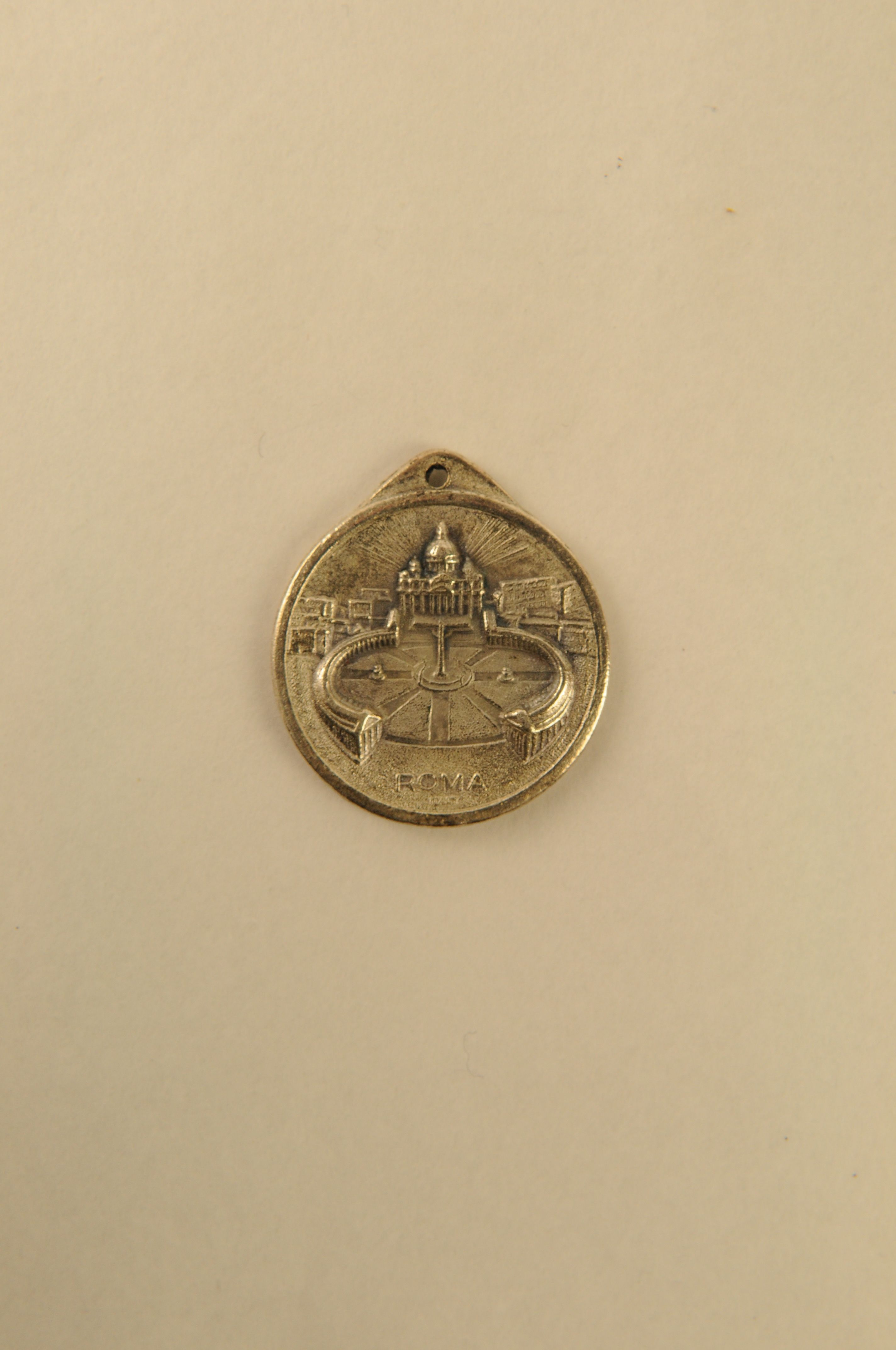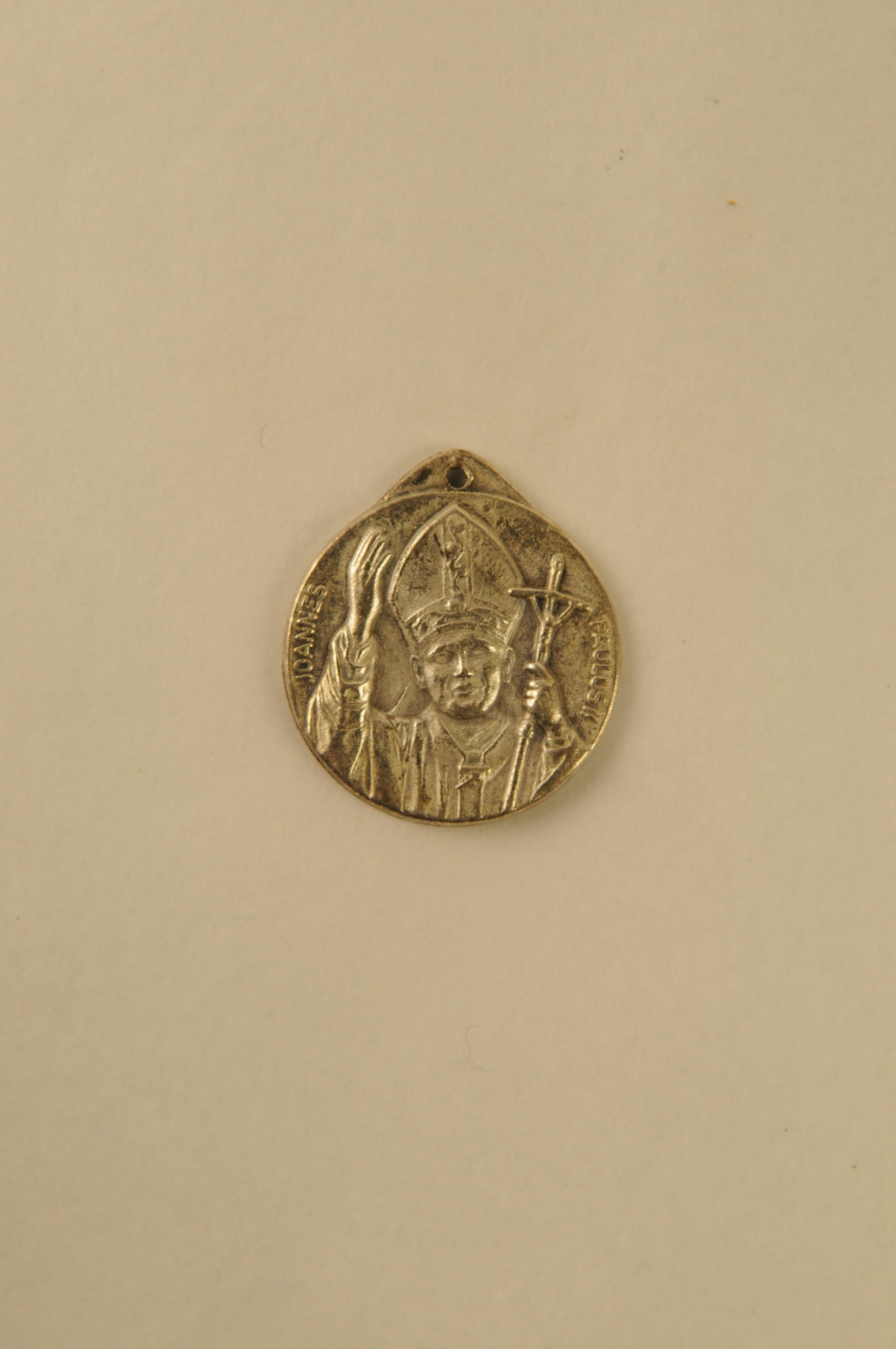 Religieuze medaille/draagpenning, materiaal: metaal, verzilverd, ronde penning met aan vz. frontaal portret van paus Joannes Paulus II met mijter en staf met randschrift ‘JOANNES / PAULUS II’ en op kz. afbeelding van de Sint Pieterskerk te Rome met onderschrift ‘ROMA’, 3,8 x 3,4 x 0,2 cm