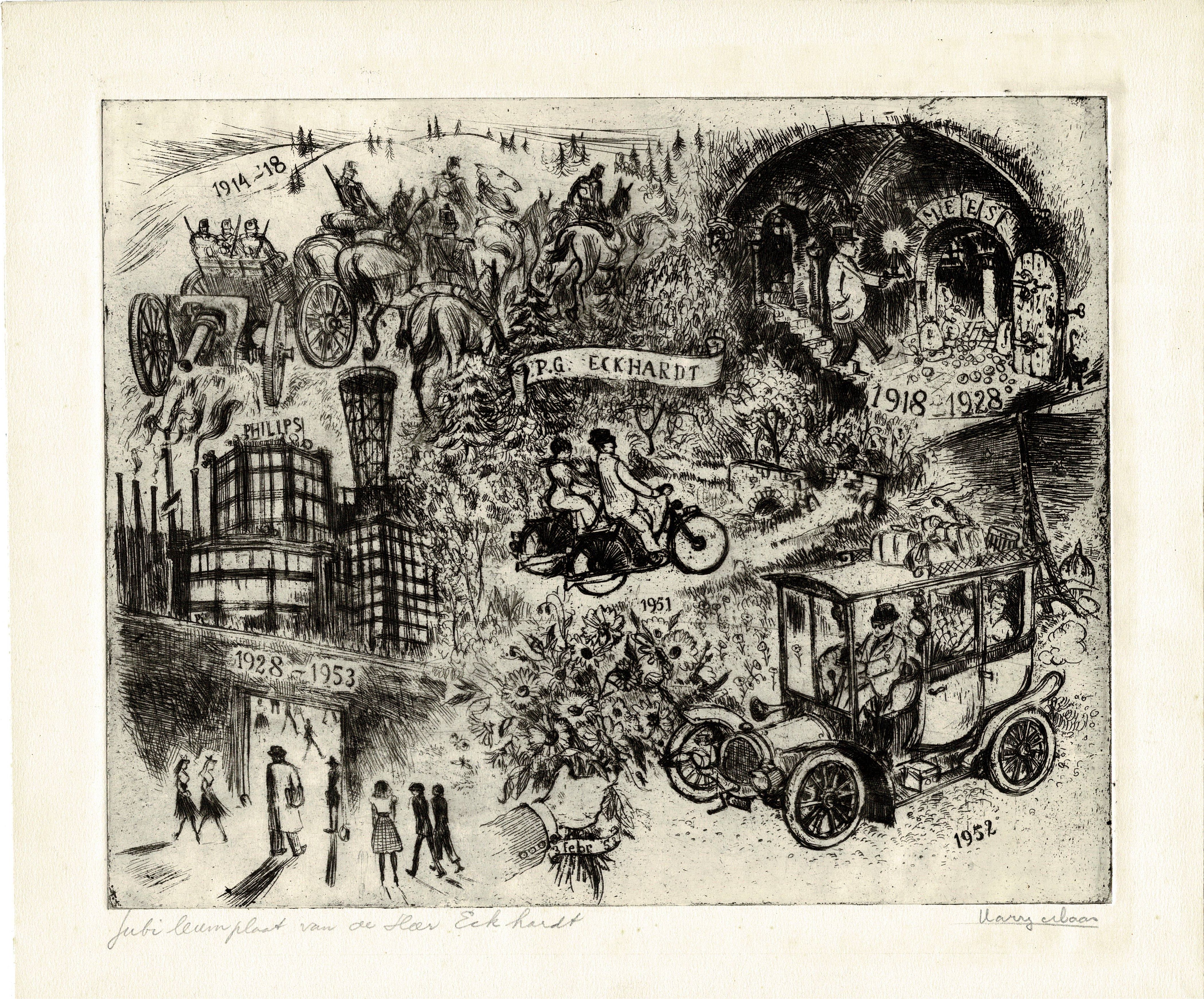 Jubileum Petrus George Eckhardt - 1953, ets/papier, 239 x 296 mm, gesigneerd onder plaat in potlood r.o.: Harry Maas, geannoteerd onder plaat in potlood l.o.: Jubileumplaat voor de heer P.G. Eckhardt, HN- nr M1-111