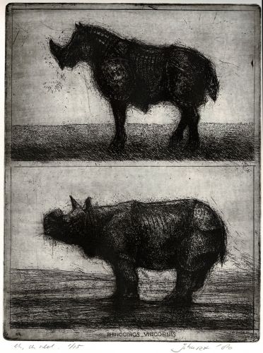 geannoteerd in plaat m.o.: RHINOCEROS UNICORNIS gesigneerd, geannoteerd en gedateerd in plaat r.o.: Johannvs H.fecit 1980 aqva fortis in potlood onder plaat l.o.: ets, dr nld. 1/15 in potlood onder plaat r.o.: j.hurx '80 inventarisnummer sociale dienst: GW 3708 bedrag BKR: onbekend