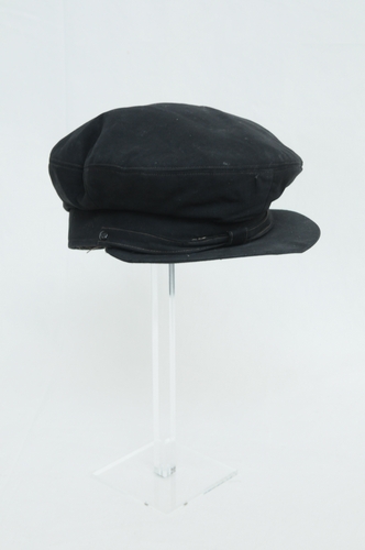 Pet; boerenpet, materiaal: Ottermanzijde, kleur: zwart, lengte 40 cm, breedte 36 cm, hoogte 9 cm, bol uit een stuk, sierstiksels langs de rand, voor bovenklep bandje met lus doorgestikt, een knoop ontbreekt, bolvoering: lila gestreept, maat 53 kleur; zwart (verschoten) Gedragen door de vader van de schenker: Cornelis v.d. Vijfeijke (Waalre 1896 - Laarstraat 57 Aalst ...
