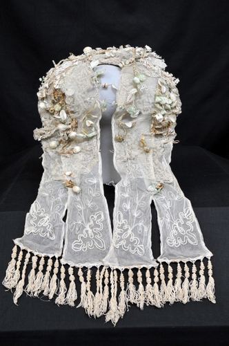 Poffer, materiaal divers, kleur ecru/groene bloemblaadjes, lengte 90 cm, breedte 43 cm, tule linten versierd met haakwerk en band. Losse franje aangenaaid. Aannaaipunt verstevigd met laiton. Halverwege de tule linten ook versteviging met laiton. Linten lengte 48 cm, breedte 10 cm. Herkomst Son, gedragen door Mevr. Hendrina Lavrijssen-Ketelaars. Deze werd in 1879 in St.Oedenrode geboren ...