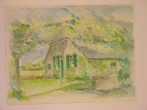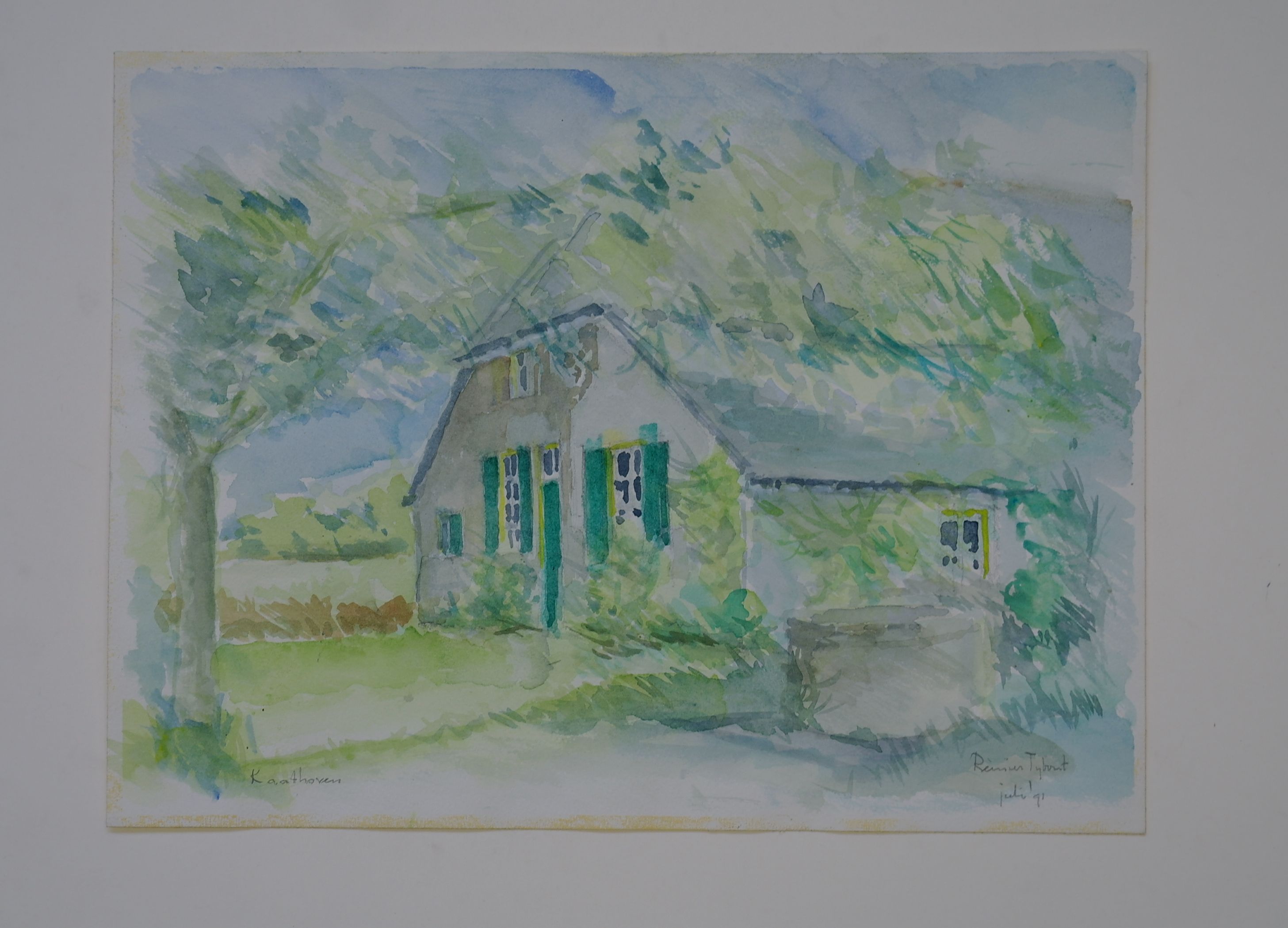 Kaathoven (voorzijde van een halleboerderij) – 1991, potlood en aquarel/papier, gelocaliseerd potlood l.o.: Kaathoven, gesigneerd en gedateerd potlood r.o.: Reinier Tybout juli ’91, 304 x 403 mm Kaathoven (voorzijde van een halleboerderij) – 1991, potlood en aquarel/papier, gelocaliseerd potlood l.o.: Kaathoven, gesigneerd en gedateerd potlood r.o.: Reinier Tybout juli ’91, 30.4 x 40.3 cm