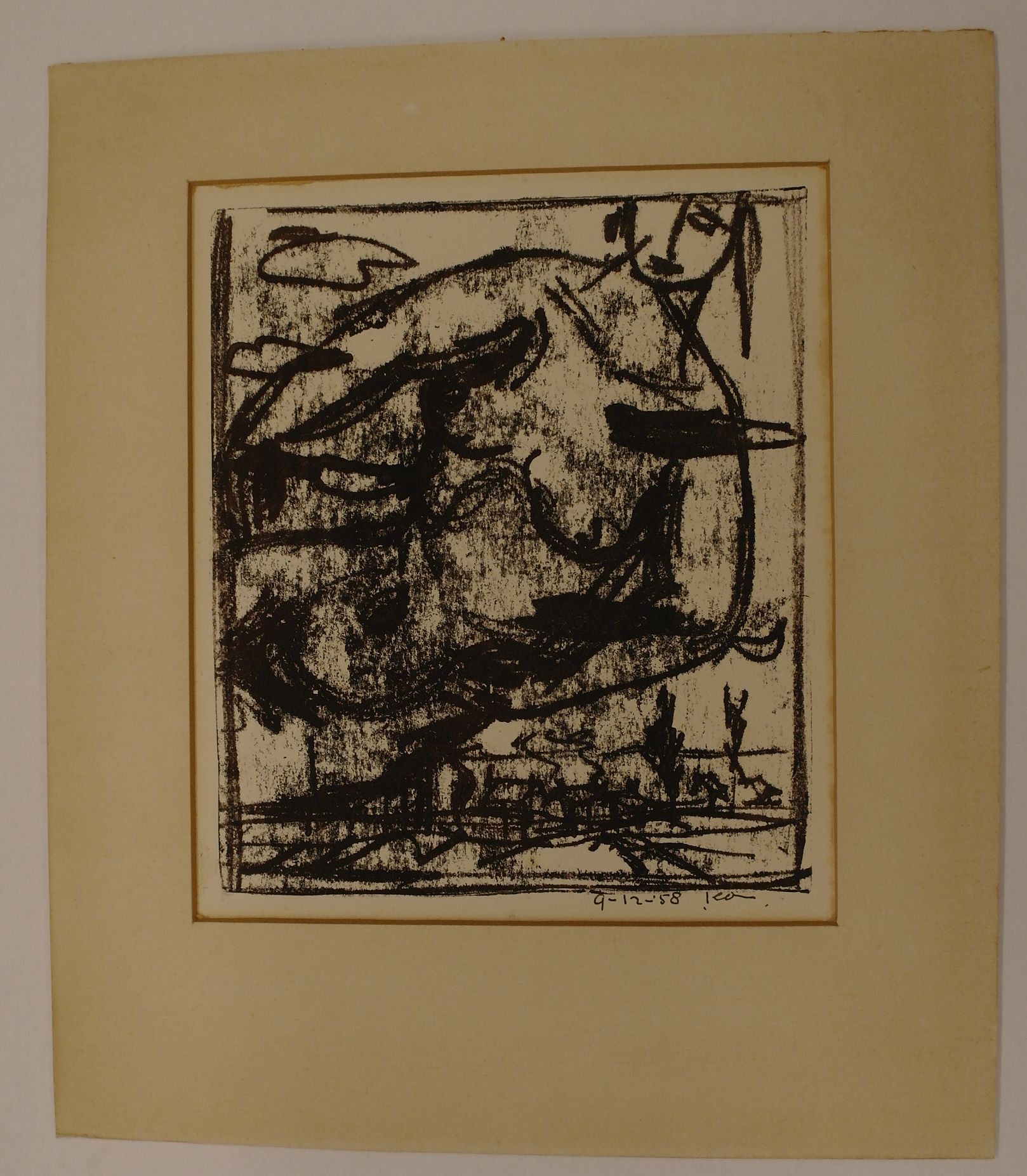 Vrouwelijk naakt boven landschap – 1958, monotype/papier, 190 mm. X 165 mm., gedateerd en gesigneerd r.o.: 9-12-‘58 Leon